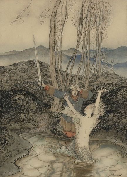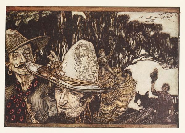 Curator: Let's explore "Jensina Proves a Born Housewife," a whimsical 1925 drawing by Arthur Rackham, rendered in ink and watercolor on paper. It’s part of a series illustrating a fairy tale, capturing a peculiar moment with, well, a remarkable cast. Editor: Remarkable is one word! My immediate thought is, what an unsettling scene. It looks almost surreal, like a dark comedic tableau vivant. Is that a puppet seemingly trapped amidst domestic chaos? Curator: The puppet figure definitely strikes a jarring note. But notice how Rackham uses the mole family to embody traditional domesticity. There's a clear hierarchy, even gendered roles represented. Look at the mother mole by the doorway with the little bonnet. There's also a larger one, seemingly a male figure, smoking a pipe above. What kind of statement, then, do you feel Rackham might be making with this juxtaposition of mole society, household chores, and this bizarre puppet figure at the center? Editor: Rackham’s deployment of those roles feels undeniably satirical. Given the era, could this illustration be interpreted as a critique of idealized domesticity imposed on women? The puppet, appearing lifeless while draped in drying laundry, perhaps symbolizes women as manipulated figures. The puppet becomes an allegory, representing the constraint of imposed domestic roles and a patriarchal structure embodied by those nonchalant, pipe-smoking moles looking down on it. Curator: An interesting perspective. Symbolically, water itself has long been associated with purification and renewal, perhaps a symbolic cleansing. Rackham was, after all, deeply inspired by folklore and Norse mythology. Laundry itself is quite symbolic and acts here almost as a shroud. Considering those multiple layers, it raises the complexity of Rackham's commentary beyond just patriarchal constraints and hints at themes of self-transformation through symbolic rituals. Editor: That’s a fair point. By employing water motifs so strategically, the work transcends a singular message, urging dialogue about tradition and potential. Still, I am most interested by that strange puppet. Its rigidity suggests a deep-seated resistance, or at least a haunting of past impositions. Curator: Rackham often layers his images with archetypes. His exploration of established societal systems are deeply personal but presented within established cultural motifs. Seeing how we have responded to "Jensina Proves a Born Housewife," it makes me wonder, what other visual allegories hide beneath the surface, waiting for our attention and exploration? Editor: It's certainly a thought-provoking work. I appreciate how Rackham uses humor to confront deeper cultural anxieties, offering space to question traditional expectations—even today.