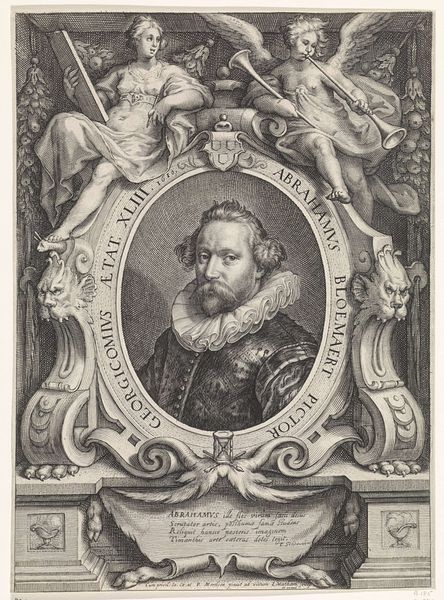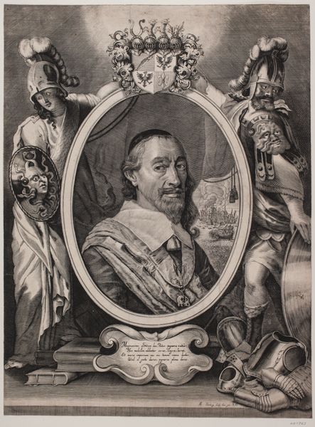 Curator: Here we have Hans Andreas Greys' engraving, "Palle Rosenkrans til Krenkerup," created sometime between 1634 and 1644. It's quite striking, wouldn’t you say? Editor: Absolutely. My first impression is how densely packed it is, teeming with details. There's a palpable sense of status and power emanating from it. It is also oddly morbid. Curator: Indeed. The portrait, centered within an oval frame, depicts Palle Rosenkrans, a nobleman of the time. The surrounding allegorical figures, heraldic shields, and Latin inscriptions tell a rich story, revealing a complex construction of identity. Look at how the central figure’s likeness is meticulously crafted through engraving, showcasing not just his physical appearance, but his position within a deeply structured society. This work invites questions about patronage, the role of the artist as a creator but also social documentarian, and of course about how art can reveal truths about those holding positions of privilege and influence. Editor: Yes, and that engraving technique, consider the material process behind it – the skill required to render such fine lines, the labor invested, even the very metal upon which the image is etched speaks volumes. Note how these coats of arms reinforce ideas about legacy and inheritance through skillful repetition of a key emblem to further amplify family prestige. Then our eyes naturally follow the skeleton, sitting mournfully at the bottom corner on top of an orb. The tools and methods employed are as vital to understanding the piece as the imagery itself. Curator: Exactly. The symbolic language employed – the figures of Justice, Charity, and even Death, alongside the Rosenkrans family crests – offers a commentary on virtue, mortality, and lineage within the framework of 17th-century Danish society. I feel there's a fascinating intersection between personal identity, family legacy, and social obligation, reflecting both the opportunities and limitations experienced within a feudal power dynamic. The skeletons further seem to imply even legacy is limited, making it such an interesting intersection of these different ideals. Editor: And even the scale, we can't ignore how the printed material, whether on a humble sheet of paper or some fancy broadsheet, enables wider distribution of this representation, of Palle Rosenkrans’s image. It transforms him from a man into something consumed through printing technologies. This seemingly changes its inherent qualities and meaning entirely. Curator: Considering these points, perhaps what we are really grappling with when faced with this work is not simply a picture of a nobleman, but a potent visualisation of the interplay between individual and structural authority. It truly serves as a case study. Editor: Ultimately, I am reminded that this engraving is a window into how status and material come together in complex arrangements, providing valuable points of historical context on Danish history through class consciousness.