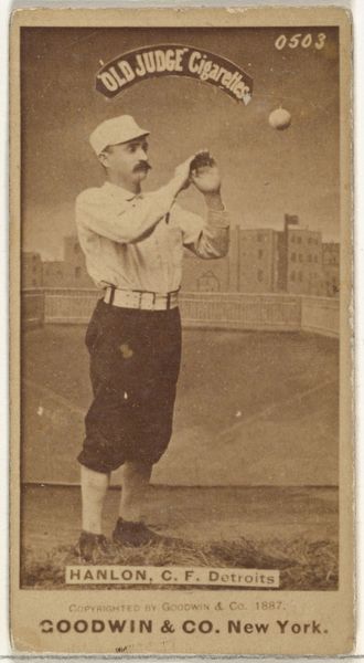 Editor: This 1888 image, "Edward Hugh 'Ned' Hanlon, Center Field, Pittsburgh," offers an intriguing glimpse into the early days of baseball, originating from the Old Judge Cigarettes series. My first thought: sepia dreams. There’s a ghostliness, almost, a quiet melancholy. Curator: That spectral quality is intriguing, considering the context of its creation and dissemination. Goodwin & Company used these photographic prints as trade cards, inserting them into cigarette packs. Editor: Right, instantly connecting this "high art" with a mass produced consumable product—the ephemeral nature of a cigarette pack colliding with this effort at documentation or memorialization. How very Benjaminian. What strikes me is how tactile the image looks. You can almost feel the coarse material of Hanlon's uniform. Curator: Tactility is definitely one key feature of its aesthetic impact. Look closely at the interplay of light and shadow across his face, defining his mustache and concentrated gaze. The backdrop is purposefully simple. A brick building rises in the distance. It offers a visual rhyme of verticals and horizontals with Hanlon’s vertical figure juxtaposed against the horizontal lines of the fence. The visual rhythm emphasizes a balance between individual presence and architectural context. Editor: The scale, too, speaks volumes about accessibility and dissemination. As part of a series designed to boost cigarette sales, there’s a blurring of the boundaries between portraiture and advertising. You mentioned light. Note also how the almost clinical lighting levels him. Curator: Indeed. The photographic medium itself further collapses distinctions. Here, photography flattens lived experience into a portable, commodifiable image, destined to circulate in the marketplace and culture in tandem. This form of visual production played a key role in shaping and solidifying celebrity culture, wouldn’t you agree? Editor: Absolutely. Think about the conditions of labor involved: the photographers, the factory workers assembling the cigarettes and inserting the cards. The commodification of athleticism intersects directly with labor practices and emerging forms of marketing. Curator: Viewing this through a formal lens, consider how the pose encapsulates anticipation. A perfectly composed geometry of body, ball, and distant architecture. Each compositional choice leads the viewer’s eye throughout the frame, creating harmony. Editor: Exactly—Harmony created from a collision of labor, industrial process, celebrity culture, and consumption! An uncanny still frame in cigarette packs for our evaluation over a century later. Curator: Ultimately, a compelling example of art operating as a vehicle for culture, beautifully crystallized in a single photographic print.