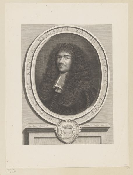 This is Nicolas de Poilly's portrait of Louis Prevost, made as an engraving sometime in the 17th century. The oval composition immediately suggests a controlled, classical aesthetic. Notice how the figure of Prevost is framed, not just by the shape, but by an inscription that encircles him, literally containing him within language and status. Poilly uses line work to create texture and depth, particularly in the elaborate wig, which dominates much of the visual field. The texture is counterposed with the smooth planes of Prevost's face, emphasizing his gaze. The inscription reinforces the sitter’s identity, embedding him within the structures of power and representation of the time. Consider how this portrait, through its formal elements, presents an individual not as a free-standing entity, but as one constituted by social and linguistic frameworks, and the semiotic codes of clothing and adornment. These elements tell us much about the cultural and philosophical understanding of identity during the period.