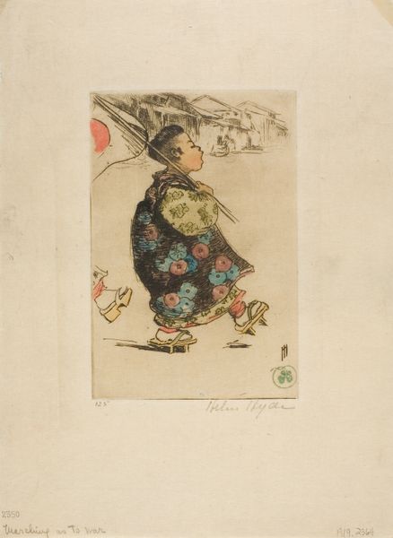 Curator: Here we have "Lopende vrouw" or "Walking Woman" by Leo Gestel, dating from 1891 to 1941. It’s currently held in the Rijksmuseum collection. Editor: My first thought? Solitude, a sort of muted resignation in her posture. The colours contribute, too-- those gentle blues and greys washing over the figure almost render her invisible. Curator: Gestel utilizes watercolour and pencil on toned paper. The lightness suggests this might be a page torn from a personal sketchbook rather than a formal piece intended for exhibition. Notice the subtle bleed of the watercolour; a likely product of paper production costs forcing thinness, which would naturally absorb liquid much faster. Editor: Absolutely, it lends itself beautifully to that watercolour effect, giving everything a fleeting quality as if we are just catching her out of the corner of our eye, and also giving a melancholy effect because it looks more vintage or weathered in a way. She's there, then almost gone, back into the flow of the city… or maybe just escaping the farm. Curator: The details of the cape— the decorative trim picked out in darker hues – offer a glimpse into the sartorial economy of the time. It points to the access and labor invested in garment production of this specific style within the region where the artwork was produced, probably reflective of trade guilds and patterns. Editor: And despite the apparent rush, or perhaps escape, she's wearing such specific articles! Headscarf, voluminous coat, distinct skirt, you're right, all evidence of craft and material worth and value for the time. The choice to depict her back-turned is poignant, like watching someone recede, isn't it? What might Gestel be implying by distancing us this way? Curator: Maybe a detachment typical of modernity, in Gestel's artistic circle. There's a study here of fleeting encounters, the economics of working garments, and even a silent rebellion against established art norms, don't you think? Editor: I like the rebelliousness read-- definitely a shift away from idealized forms! It brings the everyday into focus. Curator: It really prompts me to reconsider what "value" in art and design means in the everyday, doesn't it? Editor: Precisely, seeing worth in the fleeting, in the readily available resources. Makes one want to go and paint in pencil and watercolour now.