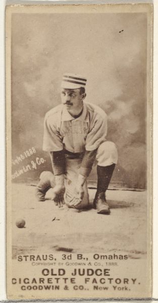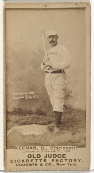 Curator: This is an image of James William "Jim" Keenan, a catcher for Cincinnati, captured in 1887 as part of the Old Judge series (N172) for Old Judge Cigarettes, a print from photography by Goodwin & Company. Editor: The sepia tone is strong. He's crouching, eyes down, like he's about to conjure the perfect pitch out of the dirt itself. Gives it a very contemplative mood. It makes me wonder what he’s thinking! Curator: These Old Judge cards represent an important intersection of commerce, celebrity, and sport in late 19th century America. Consider the way baseball's rising popularity mirrored the expansion of industrial capitalism. Keenan here becomes a commodity, his image used to sell cigarettes. It speaks to the commodification of athleticism, even in its nascent stages. Editor: Commodity might sound cold, but I also see a celebration. It's a bit like today's athlete endorsements. The way he’s poised feels incredibly human, too. It’s like he's sharing a private ritual with the viewer, inviting you into his headspace before a crucial play. Curator: Precisely. And let's consider representation. These cards were largely aimed at white, middle-class consumers, so Keenan, as a figure within this frame, reflects both the idolization and the limitations placed on athletes within a specific social hierarchy. Editor: Mmm, the photo has aged well. Do you think Keenan had any idea this image of him would endure this way? Like his ghost, enshrined at The Met, is still out there inspiring. I think about his career after seeing this... Curator: Absolutely. These images offer a unique lens through which to examine broader social narratives about labor, leisure, and identity during a transformative period in American history. What did it mean to be a celebrated athlete at this particular moment? Who was included, and more importantly, who was excluded? Editor: Definitely. There is a palpable tension between what's captured and what remains unspoken. It adds depth to this otherwise simple portrait. Curator: I agree; those tensions shape our contemporary understanding and appreciation of works like this. Editor: Cheers to looking back, not just at what we see, but what simmers beneath the surface, too. It's the kind of dialogue art begs from us, don’t you think?