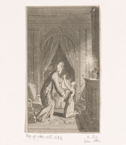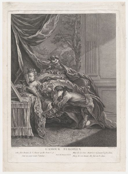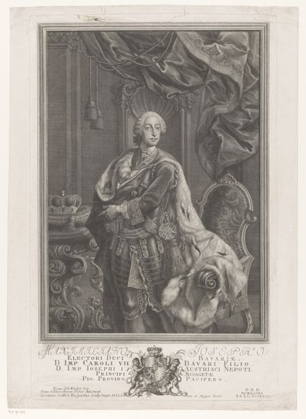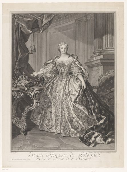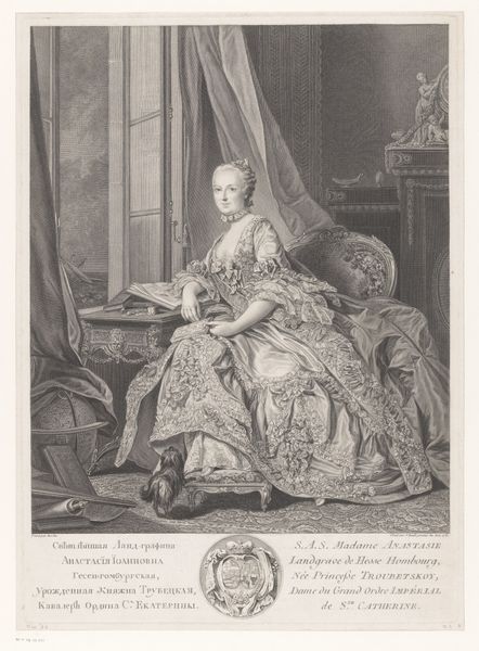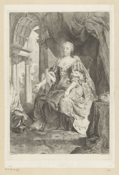 This is Georg Friedrich Schmidt's portrait of Elisabeth Petrovna, Tsarina of Russia, an engraving of impressive detail and scale. Dominating the composition, Elisabeth is adorned in elaborate court dress, a cascade of fabric that merges with the opulent interior. Schmidt masterfully uses the engraving technique to create a range of textures, from the sheen of silk to the solid mass of the architectural elements. Linear precision defines forms, yet the overall effect is one of visual saturation. The portrait operates within a semiotic system of power and representation. Every element, from the Tsarina’s gaze to the trappings of royalty, functions as a signifier of her authority. However, the sheer excess of detail and ornamentation perhaps destabilizes any fixed meaning of power. The artwork invites us to consider how visual representation can both construct and complicate the narratives of authority.