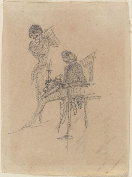 Curator: Lebasque's work, “Mevrouw Lebasque en haar dochtertje voor de piano," dated between 1885 and 1937, immediately strikes me with its intimacy. Editor: There's a delicate tenderness to the pencil strokes, a private moment captured. It’s more of a feeling than a perfectly rendered scene. The pencil marks speak volumes, right? Curator: Indeed, consider the social context: domestic life among the bourgeois. The piano wasn't just a piece of furniture; it represented status, cultivation, and, particularly for women, a sign of accomplishment. Pencil drawings at this period became vehicles of quick expression, where women especially can practice their drawing abilities due to their convenience of materials. Editor: So, sketching becomes this readily accessible medium, almost a democratizing tool within the domestic sphere, breaking away from the rigidity of academic painting perhaps. This shows how traditional art forms became challenged. Curator: Precisely! It shows shifts in production and consumption. No grand commission here. Instead, it shows a direct translation of the artist's observation using humble materials and labor in an act of observing his family’s interiority. The visible strokes create a palpable texture of a fleeting observation. Editor: The texture seems key. Given its impressionistic leanings, wouldn't the public reception have been quite different for this, away from public, salon work and more of a look inside domesticity? Was this piece of work specifically done for his consumption only, or displayed for the larger art world to consume? Curator: It is hard to pinpoint the exact reason or purpose, however, by exhibiting his family, especially the two genders, Lebasque created an understanding to challenge conventional presentation that creates a window for people who would otherwise stay on the side to reflect upon their situation in public art exhibition. Editor: Interesting...it invites contemplation on the quiet revolutions happening inside households. This simple drawing provides a nuanced reflection of its time. Curator: A soft revolution, perhaps, visualized in pencil and paper. Editor: It offers insight into domesticity and female accomplishment while expanding the idea of what “art” could be—quite impactful!