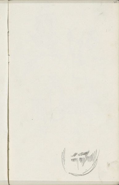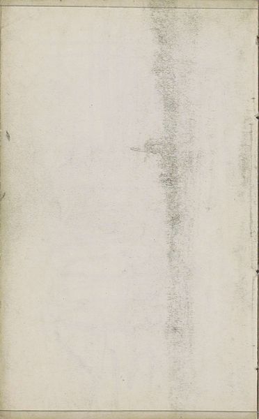 Curator: What a fascinating, seemingly empty page. This is "Annotatie," a drawing in colored pencil and graphite on paper by George Hendrik Breitner, dating from around 1890 to 1900. It currently resides in the Rijksmuseum's collection. Editor: Empty perhaps, but charged. There's a quiet melancholy here; the stark division of the pages is quite striking. It is immediately textural, aged. I find the simple color choice quite poignant as well. Curator: I agree about the texture. Notice the deliberate way the artist uses the support, allowing the paper's grain and slight imperfections to become part of the overall composition. There's a tension created by the stark division; it suggests both separation and potential connection. The composition offers both structuralist oppositions of void versus mark. Editor: That divide speaks to the duality present in the Impressionistic approach: objectivity and subjectivity intertwined. It resonates with a sort of inner struggle—the blank page as a symbol of untapped potential, perhaps weighed down by some heavy shadow of thought or memory along that ruled left margin. Perhaps the beginnings of notes that were not to be or couldn't find completion? Curator: The shadow and ruled margin also give a geometric starkness with high contrast despite the faded palette. You mention potential: Breitner was very interested in photographic practices and visual note taking to understand light, the very process you touch on. It's like the start of an idea or the tail of another, the point is process over finish. The symbolism may rest more firmly with an act, not a being. Editor: Very astute observations. Seeing this in light of a quickly compiled sketchbook for recording transient sights shifts the emotional context considerably; as does taking in its incomplete form. Curator: It reminds us that even seemingly simple drawings, when examined closely, can reveal complexities and layers of meaning related to process, observation and objective concerns of capturing life as light. Editor: And ultimately perhaps, capturing some of the inner world of the artist, even inadvertently. A valuable point.
