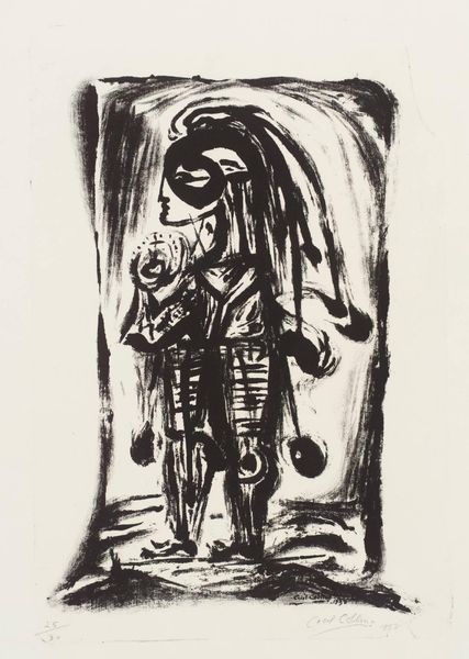 Curator: Here we have Josef Herman's striking lithograph, Mother and Child, from the Tate Collection. Editor: My first thought is the power of those bold, simplified shapes. It’s weighty, monumental even. Curator: Notice how Herman reduces the figures to essential forms, creating a sense of timelessness through abstraction. The interlocking shapes emphasize the figures' interconnectedness, focusing on the aesthetic relationship. Editor: Absolutely, and I think it’s hard to ignore the figures' almost facelessness. It could speak to the universal experience of motherhood, transcending specific identities. Curator: Interesting. Though I'm drawn to how the limited color palette—brown, black, and white—contributes to the composition's overall somber and grounded aesthetic. Editor: And the stark contrasts in color might reflect the hardships and resilience often associated with motherhood in marginalized communities. It's a powerful statement. Curator: It's remarkable how the interplay of form and color creates such a potent visual experience. Editor: Indeed, there is a quiet intensity. I'm left contemplating the complexities and beauty of maternal bonds.