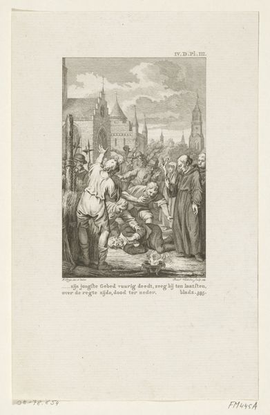 Curator: Welcome. Before us hangs an intriguing engraving, likely dating from the 1730s, titled "Straatscène met Damon met rugzak en zijn schoonvader met roede," which translates roughly to "Street scene with Damon with backpack and his father-in-law with a rod." It's attributed to Nicolas de Larmessin the Third. Editor: It’s quite busy. The overwhelming sense is of a somewhat chaotic street scene, packed with figures, the light distributed fairly evenly... the composition guides the eye deep into the image. There's a push and pull between the crowded foreground and the architecture receding in perspective. Curator: Indeed. Larmessin utilizes hatching and cross-hatching techniques expertly to achieve that recession and to define the various textures, from the smooth stone buildings to the fabrics of the clothing. Observe how the density of lines shapes form and suggests volume. It speaks to a highly developed formal language, characteristic of Baroque sensibilities. Editor: I find it equally compelling to think about the materiality of prints themselves and the labor that went into producing multiple copies. This image would have circulated quite widely, making it a fascinating lens into the social and cultural context of its time. You have bodies mingling, drinking and likely spreading rumors throughout the market and class system. This isn’t only high art; it's communication. What was life actually like? Curator: Certainly, and one cannot disregard the narratives unfolding here. The figures form discrete groups, hinting at individual stories intersecting within the larger cityscape. Note Damon, the presumed protagonist, burdened with his backpack. His discomfort becomes a focal point—a node in this network of social relations. The question begs, What’s he up to with the suspicious figure in the center? Is there something romantic in nature, or perhaps nefarious with the stern man wielding the roede. Editor: Agreed, and thinking materially about that "roede" that has such clear connections to physical, manual work gives us insight. It looks less a tool of domestic discipline and more to my point—a piece of industrial material like timber—perhaps what a porter of his father in-law worked with on any given day to survive? That, to me, highlights social relations of the era and the social classes at hand represented. Curator: That said, I still see within these class boundaries, as well as his clear formal prowess, Larmessin has organized an almost diagrammatic vision, structured by strong verticals and diagonals which work to structure the emotional landscape of the image itself. Editor: Very well stated! It shows that while we may see different layers to Nicolas de Larmessin the Third's image—be they labor and society or its Baroque structural diagram—these layers intertwine to paint us a truly beautiful world into eighteenth century life.