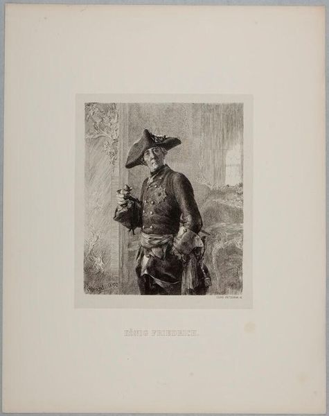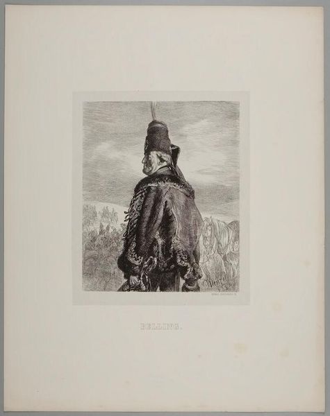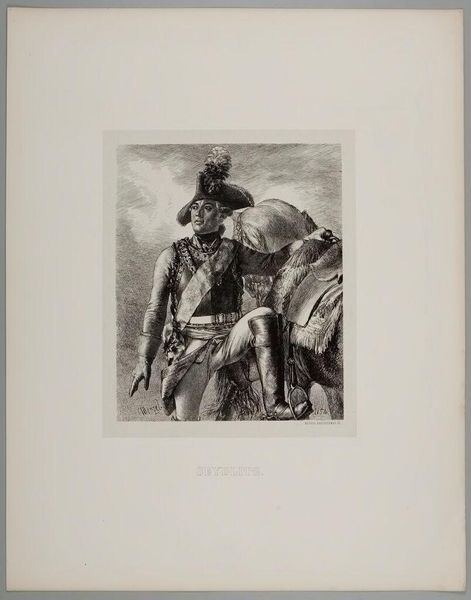 Curator: Eduard Kretzschmar offers us his interpretation of "Field Marshal Jakob Keith." The image projects a poised confidence, doesn't it? Editor: It's the gaze, isn't it? Steady, assured... and a touch melancholy? The composition feels almost staged, with the sky swirling behind him. Curator: Interesting point. I see the swirling sky more as dramatic tension—a landscape mirroring the inner turmoil of command. His hand resting on what looks like a telescope? Editor: A semiotic anchor, directing our gaze, of course. But perhaps also a hint of weariness? All that looking can be exhausting, not just for the eyes. Curator: It's a wonderful balance, this portrait. Formal yet intimate. Perhaps Kretzschmar, through Jakob Keith, is suggesting, to observe, is to also experience. Editor: Well put. It certainly encourages reflection on leadership, vision, and the burdens they bear.