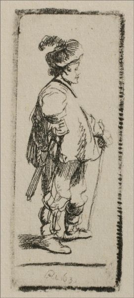 This is an etching called "Standing Farmer with Stick," and it was made by an anonymous artist. Likely created in the 17th century, this period in the Netherlands was marked by significant social stratification, with rural farmers occupying the lower rungs of society. The etching portrays a farmer in simple, unadorned clothing, holding a walking stick. His hunched posture and weathered appearance speak to the hardships of rural life. While seemingly straightforward, this image offers insight into the complex social dynamics of the time. The farmer's attire and posture signal his economic status, while the walking stick could symbolize both his reliance on the land and his vulnerability. The artist's choice to depict a farmer as the subject of art underscores the growing interest in the lives of ordinary people. Yet, it may also perpetuate stereotypes about rural communities. How does the work make you feel? Does it evoke empathy, curiosity, or something else? This etching invites us to consider the lives of those who have often been overlooked in art historical narratives.