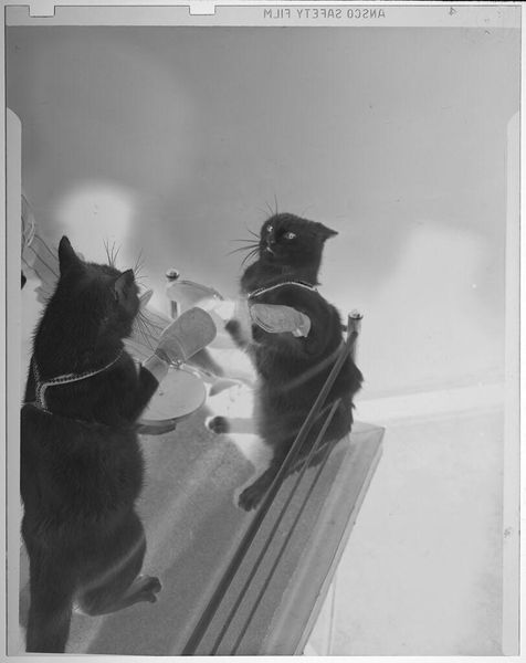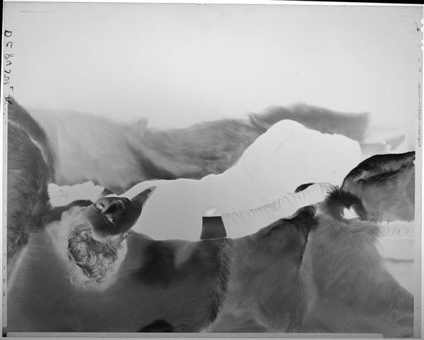Editor: Here we see "Untitled (two cats 'standing' in boxing ring wearing mittens)" by Jack Gould. It’s a black and white photograph. I find the scene playful, even humorous. What layers do you see beneath the surface? Curator: I find myself pondering the anthropomorphism at play. The cats, posed as boxers, bring up questions around power dynamics and performance, almost mocking the human obsession with competition and hierarchy. Where does the humor end and a critique of societal roles begin? Editor: That's interesting. So you see it less as a funny picture and more as social commentary? Curator: Precisely. It invites us to question how we project human constructs onto the animal world, and in doing so, perhaps reveals more about ourselves than the cats. Editor: That's a perspective I hadn't considered, it really shifts how I see the image. Thanks! Curator: Indeed, art always holds the possibility of broadening our perspective.