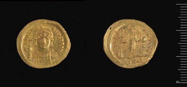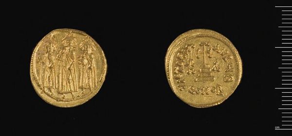 Curator: The glint of this tiny artifact is mesmerizing. It is a coin, approximately 4.4 grams in weight, bearing the image of Constans II. Editor: It feels weighty, doesn’t it? I’m thinking about its worth, its material value during its time, and how gold signified power and economic control. Curator: Precisely. Imagine the socio-political implications of this tangible object in circulation, each piece of metal carrying the imperial image. The coin acted as propaganda and a statement of political power across territories. Editor: And the production process! Who were the artisans involved, and what was their level of skill? This little object embodies an entire network of labor and resource extraction. Curator: Exactly! And the museums displaying such artifacts, it's really important to see it from a historical viewpoint to understand the importance behind such displays. Editor: This makes the material suddenly so much more expressive than gold itself.