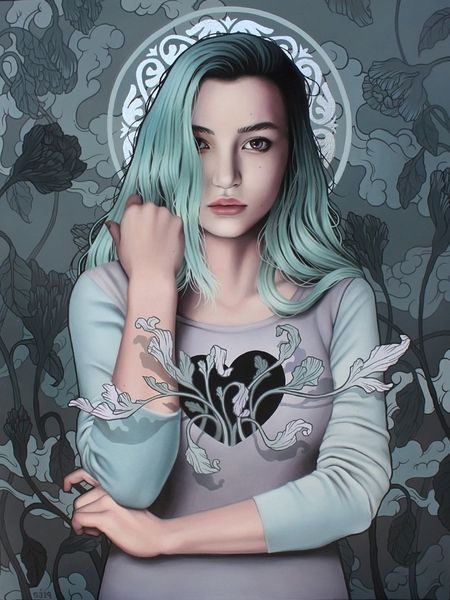 Sarah Joncas’s painting, Secret Heart, offers a vision of contemporary feminine identity through a complex interplay of visual codes. Made in the early 21st century, this portrait presents us with a young woman adorned with tattoos, including a heart-shaped key at the center of her chest, placed amidst a stylized floral background. The work reflects the increasing visibility and acceptance of body art in contemporary society. The tattoos challenge conventional notions of beauty and femininity, suggesting an assertion of individuality and personal narrative. This work engages with a longer history of the nude in art but re-imagines it for a generation that is highly conscious of the politics of self-representation. To fully appreciate this work, one could explore writings on contemporary art and gender studies, as well as visual studies. Art like Joncas's reflects the shifting social and cultural values of its time, especially in its use of the female form.