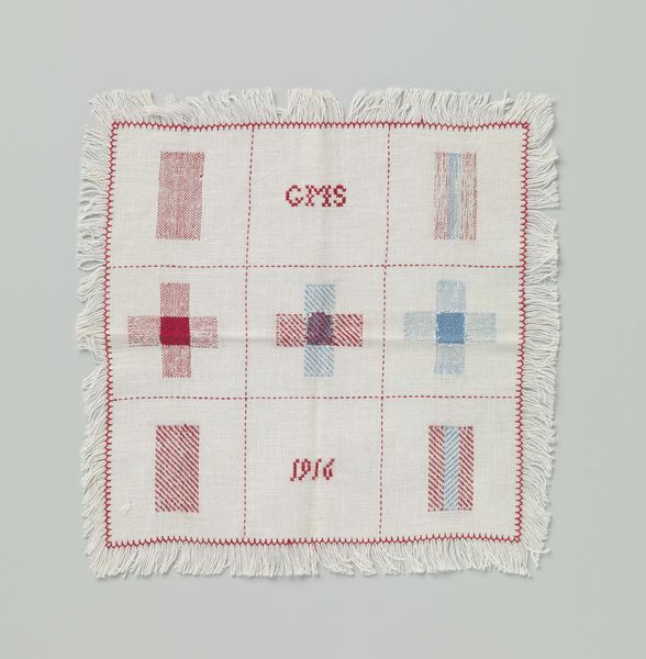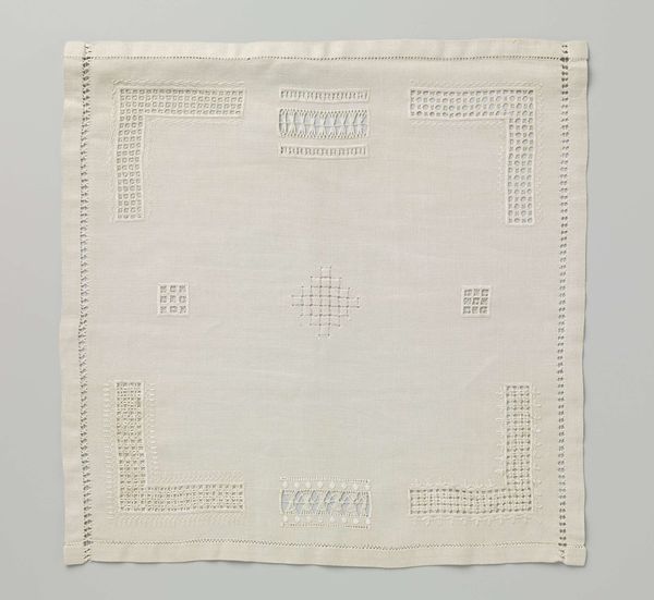 This is an undated textile work titled "Stoplap met verticale en horizontale rijgdraden" by G. Glas, which translates to "Darning sampler with vertical and horizontal threads." Its grid-like structure, formed by stitched lines, divides the cloth into a series of squares and rectangles, each containing unique patterns of colorful darns. In its original cultural context, a piece like this would have served a practical function: to teach and preserve the craft of mending. Yet, the repetitive, almost meditative quality of the stitches transforms this humble object into a powerful statement about domestic labor, particularly for women. The act of darning becomes a metaphor for repair and care, reflecting not only the mending of fabric but also the emotional work often invisibly performed. The grid could be interpreted as a representation of the constraints and structures within which domestic labor is traditionally confined. The darning sampler offers a rich perspective on the intersections of gender, labor, and artistic expression embedded in everyday objects.