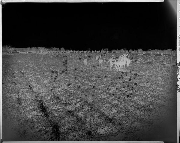Editor: So, this photograph by Harry Annas, "Untitled (cows in field)," presents this striking, almost dreamlike scene. The inverted tones create this otherworldly atmosphere. How do you approach interpreting a piece like this? Curator: It feels like a memory, doesn’t it? Faded, perhaps, but the cows...they're like anchors in this swirling field of reversed light. Maybe Annas is asking us to consider what we hold onto, what images persist in our minds. What do you think he's trying to evoke with the inverted tones? Editor: I'm wondering if it’s a way of making us see the familiar in a completely new light, disrupting our expectations. The familiar cows seem alien now. Curator: Exactly! It's about transforming the mundane into something… other. A reminder that perception shapes everything.