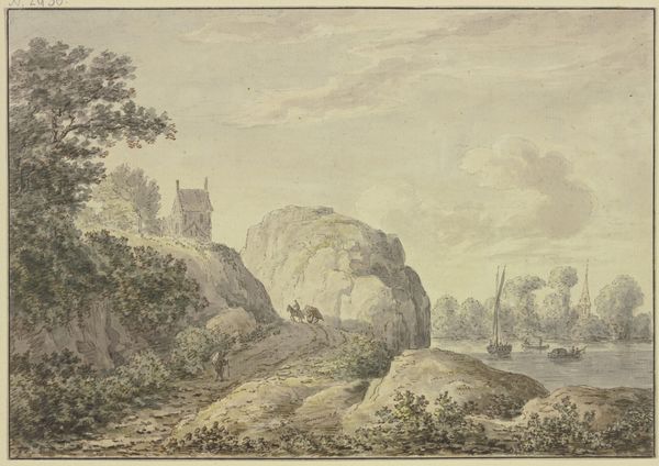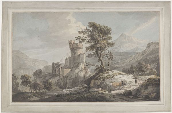 Editor: This is Thomas Daniell’s watercolor, "Cheddar Cliffs." The cliffs dominate the composition and made me wonder about the landscape's formation. What can you tell me about the materials and processes behind this artwork? Curator: The means of production are interesting. Daniell's choice of watercolor, a relatively accessible material, speaks to the developing landscape tourism and demand for picturesque views. How does this accessibility shape your understanding of the work? Editor: I never thought about it that way. Knowing it was watercolor suggests a wider audience and perhaps a different relationship with the landscape than, say, an oil painting commissioned by a wealthy patron. Curator: Exactly. The materiality informs our understanding of the painting's purpose and its connection to the emerging culture of leisure and consumption of landscape imagery. Editor: That's a great perspective. I will remember to think about the materials and production more carefully.