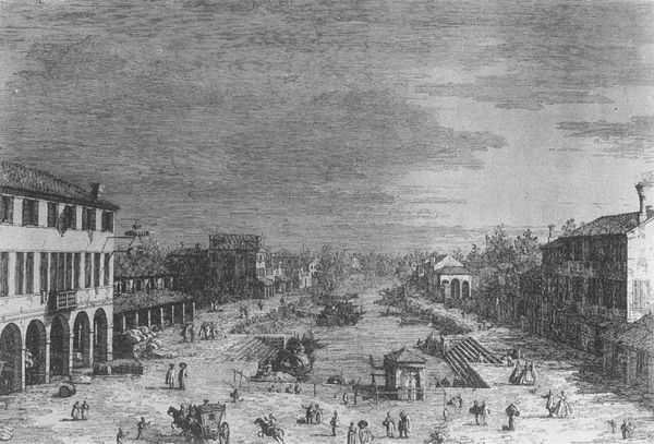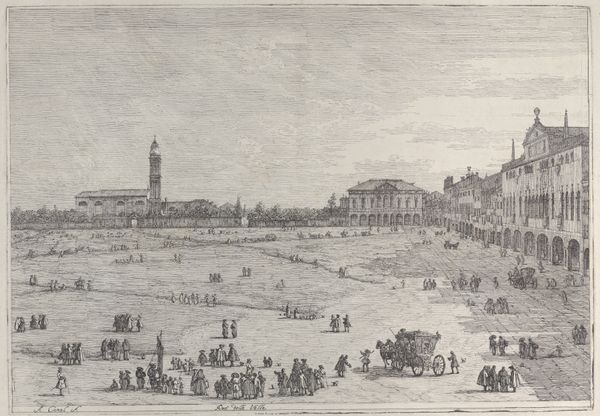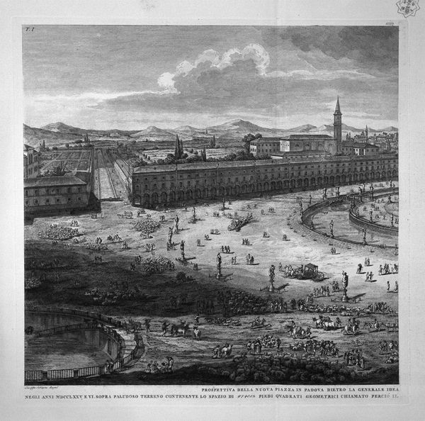 Curator: This ink and charcoal drawing on paper by Canaletto from around 1740 depicts Padua's Prato della Valle, including Santa Giustinia and the Church of Misericordia. Editor: Immediately, I'm struck by its expansive emptiness. It's a city scene, certainly, but it feels almost desolate, doesn't it? Like a stage set before the players arrive. Curator: Well, consider the labor and materials that went into creating this image. The sourcing of fine paper, the production of quality ink and charcoal – these materials were costly and time-consuming to produce. This piece reflects the consumerism of Venetian society in the 18th century, portraying civic pride while glossing over socioeconomic tensions of the day. Editor: Fascinating. Though for me, it feels like looking back in time through frosted glass. It's undeniably a landscape, even a bustling city, yet the monochrome tones strip away the immediate sensory experience. I see history, not the vibrant daily life it represents. Curator: Precisely. The medium dictates the message. It's a drawing, not a painting. We aren't invited into a scene with brilliant colors to excite us, but offered something akin to blueprints to analyze Venetian engineering and urbanization efforts. Consider Canaletto's technique too – precise lines, attention to architectural detail. This was commissioned artwork of sorts, meant to serve practical as well as aesthetic ends. Editor: Yes, I see what you mean about architectural focus. I am surprised by how much information is included, rendered with so much precision with seemingly minimal material, such as ink and charcoal on paper! Also, it's funny, the more I look at the characters included in the landscape, the less alone it appears! The people seem to animate what otherwise feels vacant. Curator: Indeed, it reminds us that artworks can act as social documents, even if their purpose involves some level of idealistic vision or outright beautification of the period they portray. Editor: So true. Seeing the layers beyond a straightforward presentation makes it a bit magical. I am now experiencing it not just as a picture but also as a thought. Curator: Exactly! It’s the physicality of materials and the labor involved that make this more than just a picture; it’s a window into 18th-century Venetian culture. Editor: Thanks, I like the view.