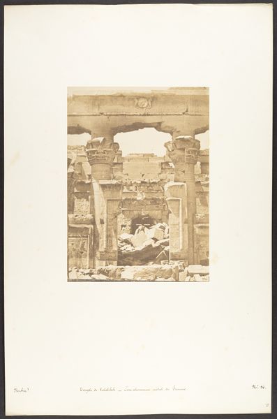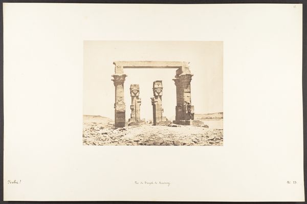 Edouard Baldus captured this photograph of the entrance to the Cour Lefuel of the Palais du Louvre using a calotype negative. The image presents a symmetrical architectural facade anchored by the columns and horizontal entablature. The limited tonal range lends a graphic quality to the scene, focusing the eye on the detailed textures of the stonework. The photograph’s composition emphasizes a structured hierarchy, from the heavy bases of the columns to the ornate friezework above. This formal arrangement reflects the 19th-century interest in order and classification. The image operates almost as a study in architectural semiotics; Baldus presents a system of signs where each element contributes to an overall representation of civic grandeur. Consider how Baldus captures the play of light and shadow to articulate form and texture. This technique elevates the photograph beyond mere documentation and invites us to consider the language of architectural form as a form of cultural expression. The photograph remains a complex interplay between objective recording and artistic interpretation.