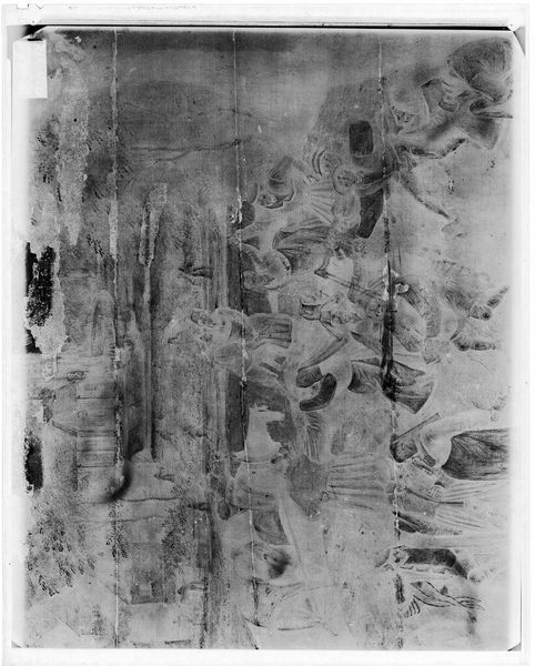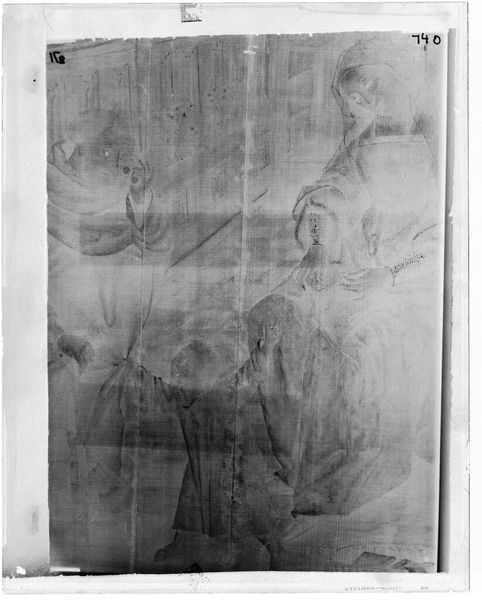 Curator: This is an X-radiograph of "Christ in the House of Simon," after Dieric Bouts, housed here at the Harvard Art Museums. It looks almost ghostly. Editor: It certainly does. It’s fascinating to see the painting stripped down to its bare bones, revealing the underlayers of the materials. I imagine a conservator using this to understand its construction. Curator: Precisely. The X-ray provides insight into the artist's process, perhaps even revealing earlier compositional choices. Seeing it helps us understand the painting's history, not just its aesthetic qualities. Editor: It’s a stark reminder that even the most revered artwork is, at its core, a product of labor and materials. And the image itself becomes a document of its own unique journey through time. Curator: A potent intersection of art history and scientific analysis. Editor: Indeed, offering us a glimpse beneath the surface, literally and figuratively.