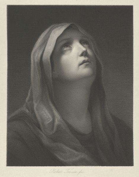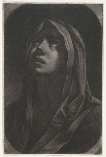 Curator: The sense of profound sorrow emanating from this work is striking. It’s Wallerant Vaillant’s *Mater Dolorosa*, believed to have been created sometime between 1658 and 1677. Editor: It's primarily gray, like ash. The fabric seems heavy, coarse even, yet the rendering has such delicate precision. Curator: Vaillant, known for his portraits, used charcoal and perhaps some chalk to capture the Virgin Mary's grief. The symbolism here is rooted deep in Christian iconography: the downcast eyes, the single tear – embodiments of suffering and maternal love. This representation connects viewers to centuries of devotion. Editor: You're right, but think of the physical act, the charring of wood to create these lines. Charcoal is such a basic material, easily made. Yet the skill involved transforms something so simple into something… charged. What kind of charcoal did he have access to? How long did it take? I can't help but wonder about his process. Curator: Those choices also emphasize humility, perhaps. Mary's suffering, her sacrifice, wasn't about ostentation, but raw, personal anguish. Vaillant captures that vulnerability with startling realism, echoing themes of penance, atonement. The portrait format itself, traditionally used for royalty, now elevates an altogether different kind of power. Editor: Right. Charcoal also dusts and crumbles. A difficult material to manage, especially for the delicate highlights on her face and veil. Vaillant needed to know the materials and the effects of pressure and strokes. The medium gives an impression that any breath could erase or smudge all that the artist made with time and effort. Curator: I see what you mean; this inherent fragility underscores the ephemeral nature of sorrow. It resonates across time. What does it whisper to you as a viewer? Editor: To me it whispers, above all, of what an incredible skill he used for the materials available. He used readily available resources and a mastery of technique to evoke something of great importance. I feel awed. Curator: For me, it whispers a quiet promise that suffering, while unavoidable, is a shared human experience. It's a powerful echo, carried across the ages.