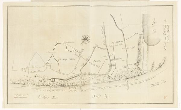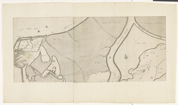 Curator: Let's turn our attention to this detailed map from 1807. It's titled "Kaart van het gebied rond de Rijn, van het veer bij Malburgen tot aan Spijk (Rijnwaarden)," created by Daniël (I) Veelwaard. It’s currently held in the Rijksmuseum. Editor: My first impression is how delicate it appears. The lines are so fine, like a spiderweb laid over the land. You can almost feel the care in the draftsmanship. What medium did Veelwaard employ? Curator: It’s primarily ink and pencil on paper, enhanced through printmaking techniques. Maps like these served a vital function; they weren't just representations but tools for governance and military strategy. The Rhine was a crucial artery. Editor: Absolutely. Think of the paper itself, though – probably linen-based, meticulously prepared. The ink, carefully mixed, perhaps with specific binders to adhere perfectly to the surface. This speaks to the artist's engagement with available material culture, connecting artisanal practice to geopolitical imperative. Curator: It is interesting to view through that lens, but look closer at how the geography is rendered – almost neoclassical in its pursuit of order and clarity. See how settlements and waterways are carefully labeled, all conforming to established cartographic conventions. Editor: But even in conforming, he exerts control. Notice the hand-drawn type and the sheer manual labor required to execute the piece, especially if you think of this process multiplied in a workshop context for different commissioning authorities. We must consider this as both representation and a result of considerable effort from human bodies. Curator: True, and the circulation of prints like this shaped public perception of territory and nationhood. By disseminating these images, governments projected their power and legitimacy. It’s very deliberate image construction that helped support their territorial ambitions. Editor: So while on the surface we have what appears to be merely an objective survey, that objectivity is deeply embedded with social relationships— between patron, map-maker, and those being surveyed. The materials become active agents in those exchanges. Curator: Viewing it through both lenses provides a richer understanding, don't you think? It highlights the intricate relationship between artistic expression, technological processes, and socio-political realities. Editor: Agreed. It shifts the conversation from simply “art” to considering the complex ecosystem in which it was created, viewed, and circulated.