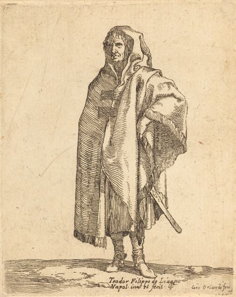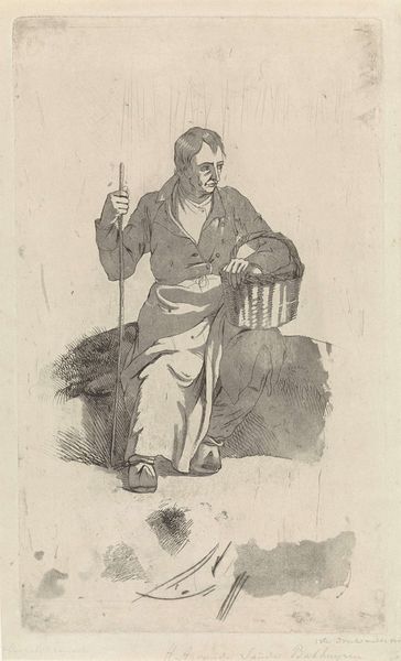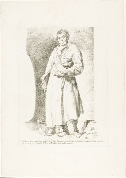 Curator: This is Francisco Goya's print, "Aesop," currently residing here at the Harvard Art Museums. Editor: The texture is captivating. You can almost feel the rough surface of the plate used to create this image. It feels very immediate, like witnessing a fleeting moment. Curator: Goya's work, especially his prints, often held a mirror up to the social and political issues of his time. This rendering of Aesop, the famous fabulist, may well have been a subtle commentary on the wisdom—or lack thereof—in society. Editor: Indeed. The way Goya used etching allows for a lot of tonal variation. You've got the heavy shadows defining Aesop's form versus the barely-there hatching describing the background. It's all in the application. Curator: Precisely. And understanding Goya's political leanings certainly enriches our perception. Editor: Absolutely. Considering the materials and techniques used helps us appreciate how art is constructed. Curator: Yes, it truly makes the work accessible.