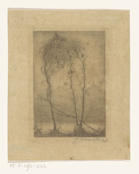 This untitled print was made by Bohumil Krátky at an unknown date and with unspecified media. The sombre colors give this piece an uncanny feeling. It reminds me a little of Goya’s darker prints, but with a different kind of dread. The surface looks rough, as if Krátky may have scratched or scrubbed the plate, and you can see how the mark-making becomes more labored and frantic towards the top of the image. I think Krátky's process is exposed rather than concealed; it almost becomes the subject. You can see the lines of the block and how he’s struggled to get the balance of light and dark, using an almost ghostly star of david to light up the composition. It gives me a feeling of the artist trying to find a symbol in the dark. It feels like an act of both remembering and forgetting.