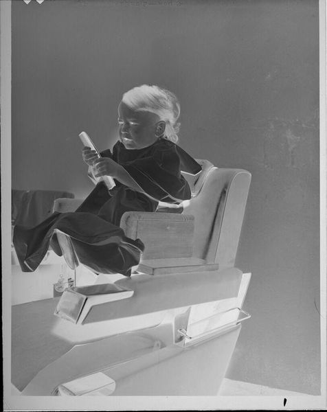 Editor: Here we have "Untitled (baby on barber chair)" by Lucian and Mary Brown, a small photograph. It’s strikingly stark, almost ghostly, because it's a negative image. What can you tell me about how the context influences this type of photo? Curator: The photographic negative, often unseen, holds immense power. Its existence allows for mass reproduction and distribution of imagery. In this case, by showing us the negative, the Browns are highlighting photography's role in shaping our perceptions of childhood and domestic life. What does the inversion of tone suggest about this power dynamic? Editor: Maybe they're questioning idealized images of childhood, by showing us this "opposite" view. I never thought about how printing photos makes them more "real." Thanks! Curator: Precisely! And consider how this challenges the presumed objectivity of the photographic medium itself.