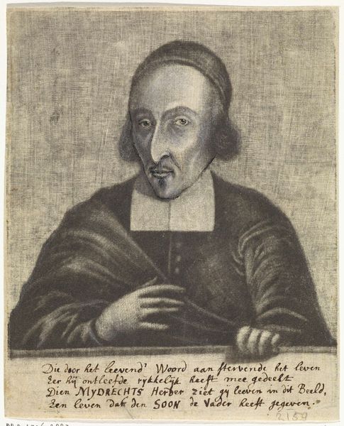 Editor: We’re looking at a drawing called "Portret van Guiljelmus Saldenus," created between 1660 and 1693, using charcoal and pencil. The level of detail achieved with such simple media is striking. What visual elements stand out to you? Curator: The meticulous handling of light and shadow immediately commands attention. Observe the tonal gradations across Saldenus's face, achieved through careful hatching and cross-hatching. How does this contrast with the rendering of the drapery in the background? Editor: It’s less defined, more atmospheric. It almost feels secondary to the subject, as if the artist wants you to concentrate on Saldenus and not much else. Curator: Precisely. Consider, then, how the artist guides our gaze. The subject’s pointed finger acts as a vector, directing our eye. Furthermore, contemplate the geometry inherent within the composition. Do you notice the interplay of vertical and horizontal lines and how this supports the overall structure? Editor: I do. The lines create a strong sense of order. Are you saying the use of geometrical shapes adds to the formality? Curator: Indeed. But note also the subtle asymmetry. His posture and gesture create a dynamic tension that prevents the image from becoming static. How would you interpret the significance of this imbalance in the otherwise formal setting? Editor: It makes him seem more alive and real. I focused initially on the naturalism. Now, I appreciate how strategically constructed the portrait really is. Curator: Indeed. We can analyze each component and then reassemble them to find new meaning within the visual presentation. Editor: That’s great; I now realize that analyzing all elements enhances meaning, too.
