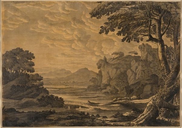 Editor: This is William Payne’s "River Scene with Fishermen Hauling their Nets, Moonlight," from around the late 18th or early 19th century. It feels very romantic and picturesque. How do you interpret this work? Curator: The scene's beauty is undeniable, but let’s consider it within its historical context. Payne, working during a time of immense social upheaval, romanticizes rural labor. Does this idealization serve to obscure the realities of working-class life? Where are the voices of the exploited? Editor: That's a good point. It is a very pretty picture, but the labor doesn't look very difficult. Curator: Exactly. The soft light and idealized figures might deflect from the socio-economic disparities of the time. How do we reconcile artistic beauty with social awareness? Editor: I never thought about it that way. It does make you wonder what he leaves out. Curator: Precisely. Questioning the narrative is key.