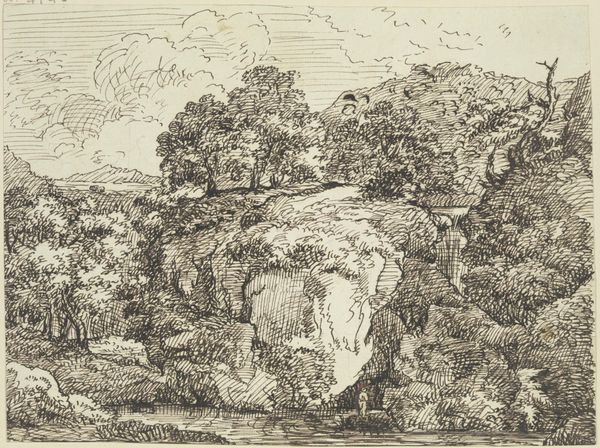 Curator: We are looking at "Felsrücken inmitten einer baumbestandenen Ebene," which roughly translates to "Rocky Hill in the Midst of a Wooded Plain" attributed to Franz Kobell, presently held at the Städel Museum. The medium appears to be ink on paper. Editor: My first impression is of a rather contained wilderness. It’s a densely worked drawing; the overall feeling is quite enclosed. What do you make of it? Curator: What strikes me is Kobell's deliberate use of ink to build texture, especially to give form to the rock outcropping. I imagine he meticulously worked from foreground to background, considering how the landscape would have been perceived from the viewer's standpoint and understanding that different forms of labor, especially relating to forestry, impact those perspectives and experiences. Editor: Absolutely, and if we position this work within the broader context of 18th-century Romanticism, aren't we seeing an emerging interest in the power of nature, one that invites reflection on humankind’s place? Notice how the dense strokes around the rock suggest not only the texture but a wild energy, like an untamed force pushing through. But at the same time, is it not framed? It has an etched borderline; in essence it tames what could easily overwhelm the eye. Curator: That’s insightful, thinking about Romanticism. When we analyze his use of hatching, it highlights his deep understanding of the printmaking process, particularly etching. He knew the value placed on crafted works, so he integrated meticulous control over the materials in hand with the romantic vision so that one could affect the marketability and ultimately the consumer desire for such items. Editor: And that deliberate craftsmanship allows Kobell to present the viewer with not just a landscape, but also an emotional state tied up within broader concepts around our relationship to nature and perhaps our power or lack thereof to dominate it, and how these things play out over society in terms of class and status. Curator: Precisely. Kobell masterfully blended an understanding of landscape perception and commercial potential with the techniques that elevated artistry. The landscape embodies a complex system. Editor: This has really highlighted how intertwined nature, art, and social consciousness can be. Thank you! Curator: A most enriching discussion.