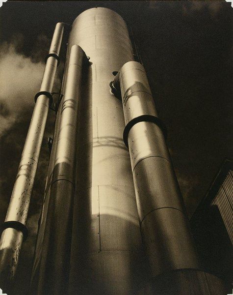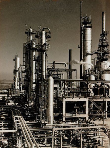 Editor: So, this gelatin-silver print, titled "Refinery," was created around 1949 by William R. Terrell. There's something stark and almost alien about the landscape. What do you see in this piece? Curator: It’s a potent image, isn’t it? Terrell’s “Refinery” compels us to consider the narratives interwoven with industrial landscapes. Looking at this photograph, especially considering its creation in the post-war era, I see not only precisionism and modernist aesthetics, but a reflection on power, labor, and environmental impact. How does its geometric portrayal evoke both progress and perhaps a looming sense of something lost? Editor: I guess it does feel like there’s a trade-off implied, the "progress" coming at the cost of something else... Were photographers at the time actively thinking about this dichotomy? Curator: Many were. Photography provided a unique lens through which to document and critique industrialization. The very act of photographing these structures was a statement. It acknowledged their dominance while also allowing for questions to be raised. What role does the photographer play in either glorifying or critiquing such subjects? Is it possible to do both simultaneously? What communities are directly affected by it? Editor: It's interesting how the image exists as both a record and a question. Seeing it in black and white heightens the feeling of… ambiguity, maybe. Curator: Absolutely. The absence of color can amplify the underlying social and political questions. And beyond that, who controls the means of production and whose stories are elevated versus those that are silenced become key points for contemplation. It’s a reminder that even seemingly objective representations can carry significant weight. Editor: Thanks, this was helpful to have context to the themes it suggests about society. Curator: Likewise, reflecting on the photographic interpretation alongside the industrial reality can illuminate complex, and important facets of society and history.