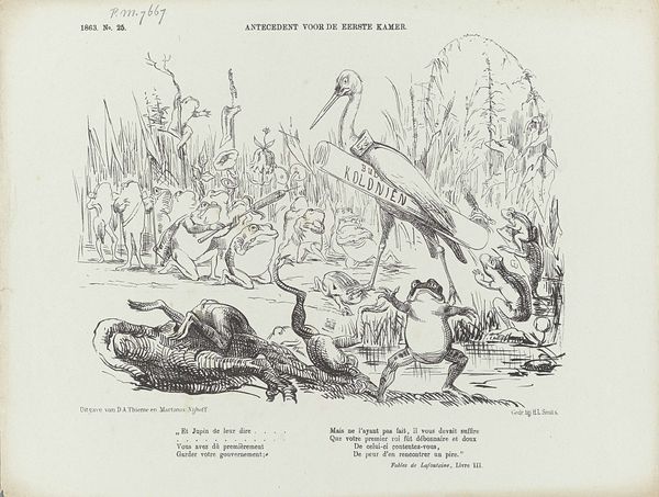 This caricature, "Spotprent op baron van Zuylen", was created in 1862 by Johan Michaël Schmidt Crans. It uses ink on paper, presenting a scene of chaotic motion centered on a steeplechase. The composition is dominated by dynamic, diagonal lines that emphasize the fall of the rider. Observe how the artist uses the formal elements of line and form to create a sense of instability and disrupted order. This collapse also invites us to consider the political and social dimensions of representation. Note the contrast between the foreground—where the action unfolds—and the background with its stable, observing figures. This juxtaposition might symbolize the tension between the individual and society, or between action and observation. The formal arrangement of the artwork, therefore, isn’t merely descriptive. It serves to destabilize conventional meanings, prompting a re-evaluation of cultural values and inviting multiple interpretations that extend beyond the surface narrative.