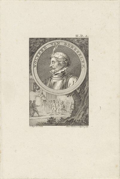 Editor: Here we have "Portret van Johan Casimir, paltsgraaf aan de Rijn," a print by Reinier Vinkeles dating from 1783 to 1795. The engraving features a framed portrait above a historical scene. What draws my eye is how the detailed portrait contrasts with the looser rendering of the figures below. How do you read this piece? Curator: The contrast you've observed offers us an entry point. Consider the context: portraiture during this era often served to legitimize power. This image presents Johan Casimir as an individual—distinguished, intellectual, almost divorced from the historical moment represented below. Does this contrast potentially critique the paltsgraaf’s disconnect from the plight and experiences of his people, represented in miniature? Editor: So you're suggesting the artist might be using the visual composition to make a political statement? I hadn't considered that. I was just focused on the aesthetic qualities. Curator: Exactly. By positioning the portrait above a scene of perhaps conflict or travel, Vinkeles invites us to consider the relationship between the ruler and those he governs. Also, note the medium: the print allows for dissemination. Who was this image for? And what impact would its message have within that specific social milieu? Editor: That’s fascinating. The accessibility of prints allowed for broader engagement with potentially subversive political messages. I initially saw it as a straightforward depiction, but your interpretation gives it so much more depth! Curator: Art is never truly neutral. By examining its context and considering its intended audience, we can unpack how art functions as a powerful cultural and political tool. This single image contains layers of complex meaning about power dynamics of its era. Editor: I will definitely remember that as I continue to explore other artworks. Thank you so much. Curator: My pleasure. Keep questioning and keep engaging.