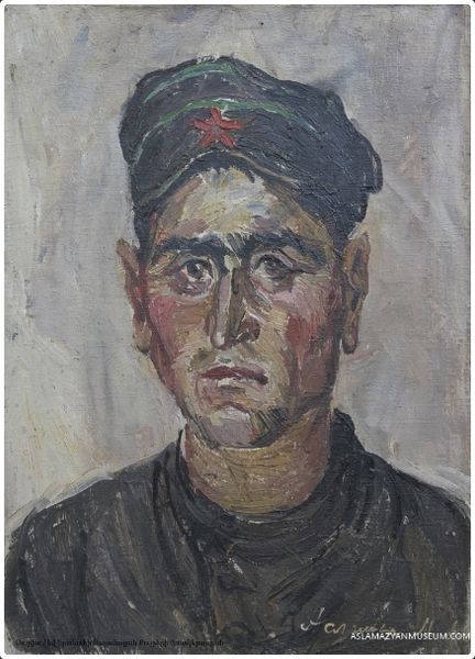 Mariam Aslamazian created this portrait, “He Lives Still With The Past” using oil paints, a traditional medium used for centuries. Aslamazian has deftly captured the dignity and weathered features of her subject. The visible brushstrokes and the way the paint is layered create texture, adding depth and character to the man's face, highlighting the weight of his experiences. The materiality of oil paint allows for rich color and subtle gradations, which Aslamazian uses to convey the man's solemn expression and the rustic setting. The artist’s skilled handling of the paint elevates what might have been a simple portrait into a powerful statement about resilience and the enduring human spirit. The choice of oil paint, a medium associated with traditional portraiture, underscores the timeless quality of the subject, suggesting a connection to both the past and the present. Ultimately, this work invites us to consider the relationship between the materials and the message, and how the artist's craft imbues the artwork with meaning and cultural significance.