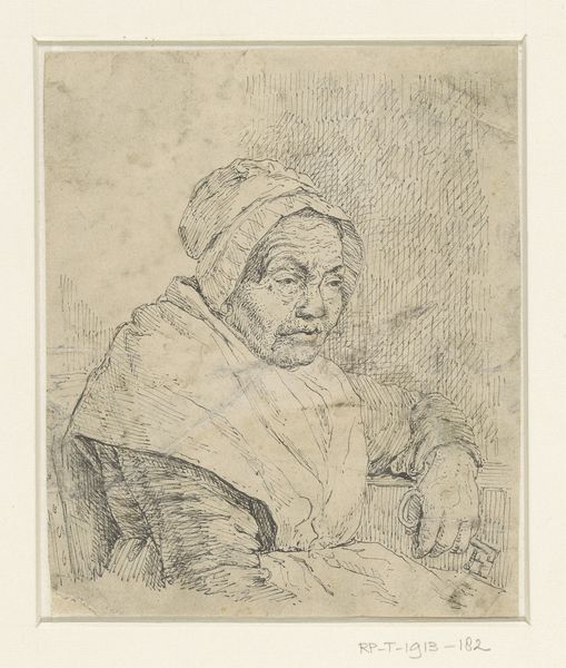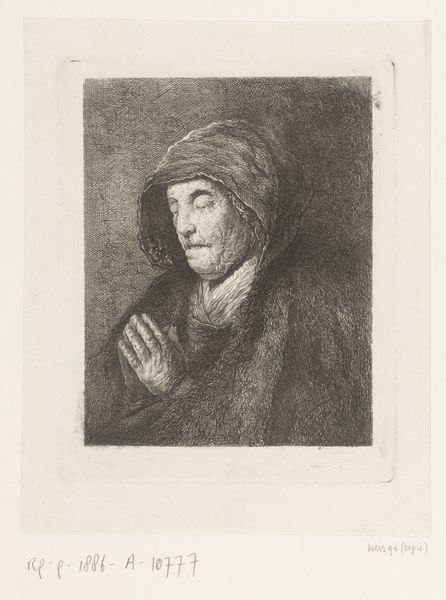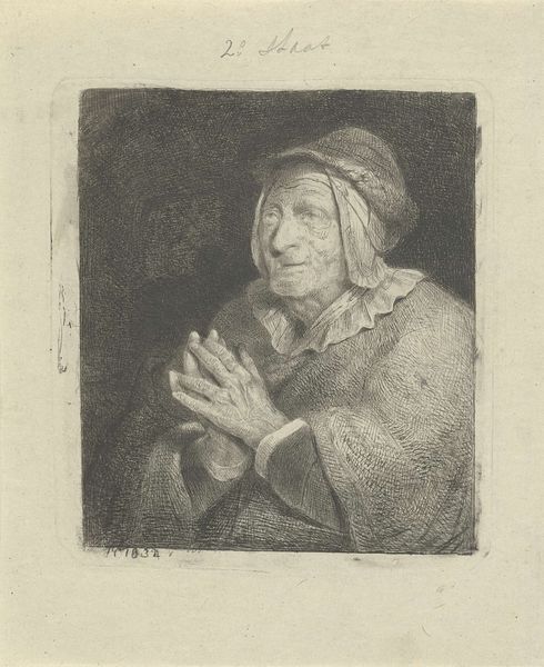 Editor: This is "Oude Vrouw," or "Old Woman," an etching by Jacobus Ludovicus Cornet from 1832. It’s a small print, and I’m immediately struck by the woman's hands – so detailed and aged. The lighting creates such a contemplative, almost melancholic mood. What draws your eye when you look at this piece? Curator: It's interesting you noticed the hands first! They're certainly a focal point. For me, it's the contrast between the incredibly detailed face and hands against the somewhat ambiguous dark background that whispers volumes. The artist has used etching to create a fantastic sense of depth. This wasn’t just documentation; Cornet really wanted us to *feel* something looking at this woman. Do you get a sense of the figure in other works by Cornet? Editor: Not really, most other prints by Cornet are landscape scenes, rather different to this realistic etching of an old woman! It seems so intimate, which I guess is unusual for the time. Do you see her as a symbol, or a specific person? Curator: That’s the million-dollar question, isn't it? On one hand, it absolutely feels like a portrait of someone specific; on the other, it echoes broader 19th-century artistic interest in portraying the human condition. Either way, she stands as a very real presence in our own time, what a joy! The beauty found in simple humility...it always makes me smile. Editor: It definitely shifts how I see etchings, thinking of them as more than just technical exercises. I'll be more conscious of that 'human condition' angle moving forward. Curator: Precisely! Now you’re seeing with an artist's heart. Next time, let's try looking beyond even that and ponder...what happens *after* the art? Intriguing.