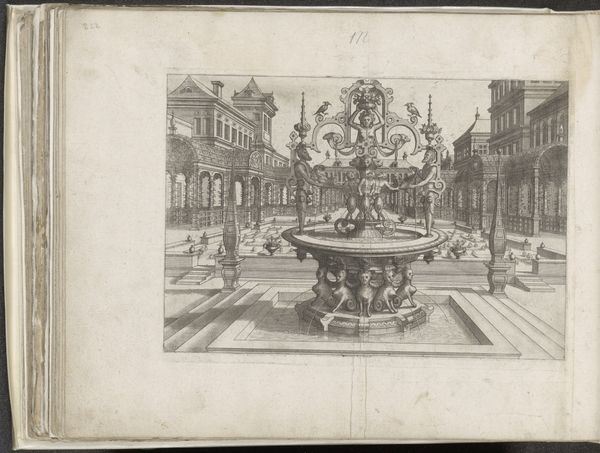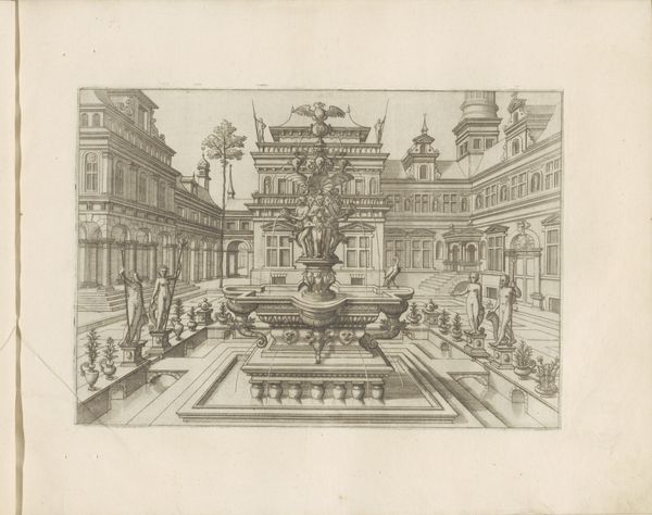 This is "Paleistuin met een ronde fontein" or "Palace Garden with a Round Fountain," an engraving by Johannes or Lucas van Doetechum. Prints like this circulated widely in the 16th and 17th centuries, offering glimpses into the lifestyles of the wealthy. What stories do these formal gardens tell about power, class, and the control of nature? The architecture and grounds create a space of privilege and exclusion. Consider the fountain as the garden's centerpiece. Classical figures and elaborate ornamentation demonstrate the owner's wealth and refinement. The garden's symmetry and order reflect a desire to control and organize the natural world. Such gardens were often places for social display, where elites could see and be seen, further reinforcing their social standing. How do these meticulously designed spaces, so different from the natural world, reflect and reinforce societal hierarchies?