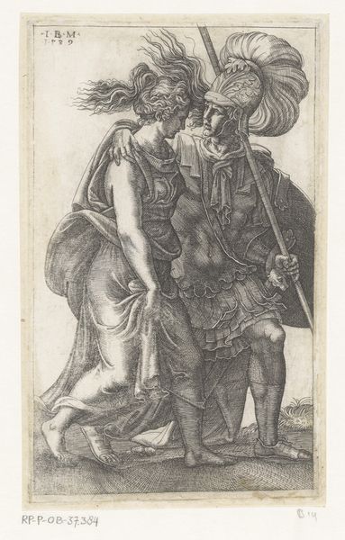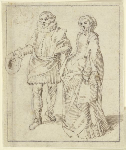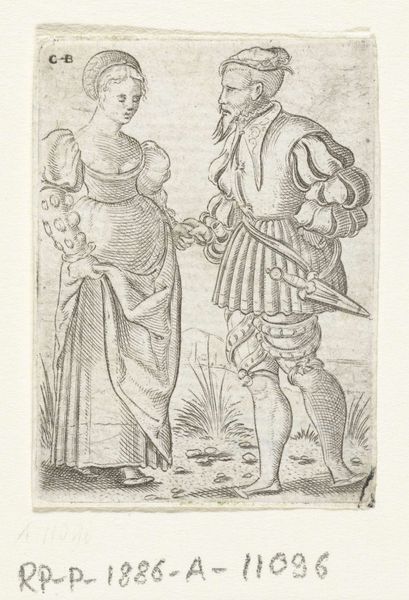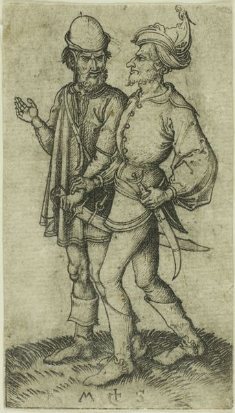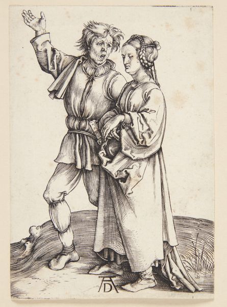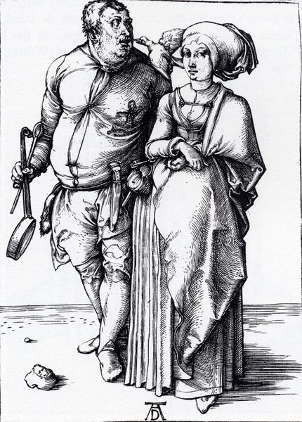 Editor: Standing here, we have "The Cook and His Wife," an engraving made by Albrecht Dürer sometime between 1494 and 1497. The starkness of the lines and the detail captured with the engraving tool are remarkable. What draws my attention is the detail in the figures' clothes and the textures Dürer creates. What do you see in this piece? Curator: It is vital to remember that this is an engraving; we see not just an image, but the result of physical labor, a collaboration between artist, tool, and metal. Dürer’s skill transformed copper into a matrix for the mass production of imagery, democratizing art through distribution. Editor: Democratizing art? How so? Curator: The print medium allowed images, and therefore ideas, to circulate with increasing ease and volume to those who couldn't afford original artworks. Looking at the "cook's" tools gives you a glimpse into labor and food preparation during this time period. Editor: It's interesting to consider this artwork through that lens, that the materiality of print is inextricably linked to labor and dissemination of imagery. Now, considering their dress and those tools... how do they speak about their status? Curator: Precisely! Dürer prompts us to think about class and consumption. His lines create not only a depiction of a cook and his wife but also invites contemplation about production of resources, material access and the economics of image-making and consumption in Renaissance society. Editor: That reframes it entirely for me. I’d only thought of engravings as being lesser in comparison to painting, but they offer such different insights into society. Curator: Yes, shifting our focus from “high art” to the conditions of art making transforms how we understand its purpose and power!