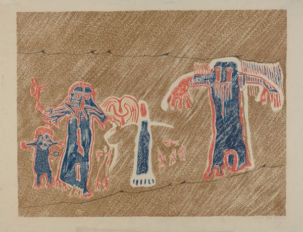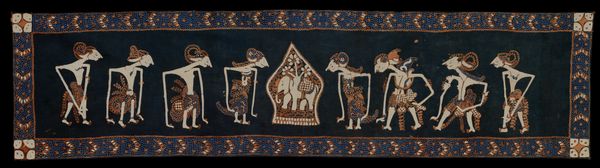 Editor: Here we have an ancient textile panel from the Chancay culture, dating back to sometime between 1000 and 1476. The weaving presents a terracotta coloured scene of stylized creatures and figures, but its symmetry makes it surprisingly…playful? What do you make of this piece? Curator: The "playfulness" you see points to an important aspect of understanding indigenous American art. Too often, we approach these works through a Western lens, seeking grand narratives and overlooking the everyday. This textile, with its vibrant colours (originally much brighter, I suspect) and repeated motifs, was likely part of a larger social and cultural fabric –pun intended! Editor: A larger fabric? What do you mean? Curator: Textiles held significant value in Andean societies. They weren’t merely decorative; they represented status, power, and spiritual beliefs. Who do you think would have been making the decisions regarding these designs, or who were they worn by? Editor: Probably someone pretty high up in the social hierarchy, right? Or, perhaps someone connected with spiritual practice, as it does give a sense of ritualistic representation of these figures. Curator: Precisely. The figures themselves, perhaps deities or ancestral spirits, reflect a worldview where humans, animals, and the supernatural are intertwined. Also consider that the textiles themselves also served ritualistic functions, not merely utilitarian ones. The repetitive geometric forms also reinforce these qualities, right? Editor: I guess, yes. I initially missed those components. This piece becomes more significant once we consider all the roles and powers that went into its use and design. Curator: Exactly! It reminds us to appreciate art's deep connections to the lives of the people who created and used it, resisting the urge to impose modern understandings on their cultures.