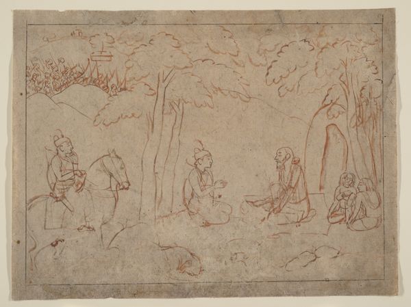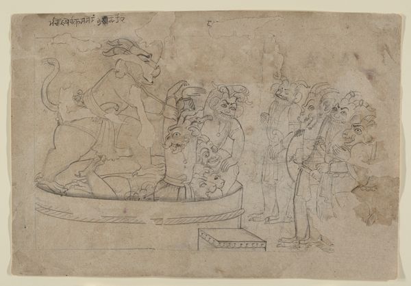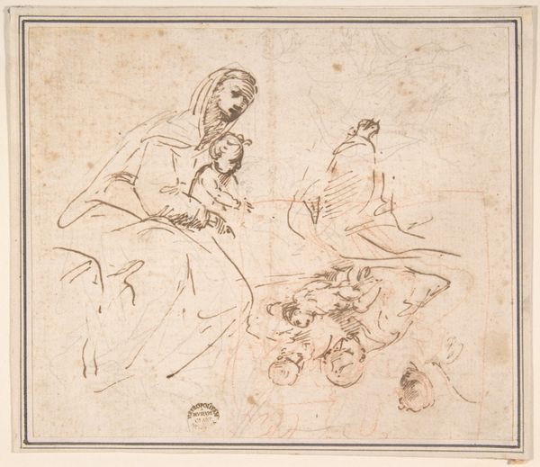 Curator: Immediately I see a monumental fragility. Look at this nearly faded pencil sketch of "River God (Tigris)" likely dating back to between 1500 and 1560. It resides in the collection of the Metropolitan Museum of Art. What impressions strike you? Editor: There is an intentional ambiguity about it, this barely-there image. It reminds me of a palimpsest, traces of an idea worked and reworked until it achieves the strength to bear meaning. What sort of symbol did a river god hold at the time of its making? Curator: The Tigris, as a symbol, carries layers. It references the physical river, of course, central to Mesopotamian civilization. But river gods in Renaissance art are seldom mere depictions of place. Often they are emblematic of power, fertility, and the bountiful gifts of nature that a ruler controls, claiming ownership over the forces that feed and sustain life. Editor: That sense of control interests me. The composition features two figures, one more commanding, one partially obscured and draped, possibly female. The interplay suggests dominance, a very classic positioning of power that extends into contemporary dynamics. Look how the implied lines direct the eye and fix the power narrative. Curator: Absolutely. But it's important to consider the original context. The Tigris isn't just a river; it’s a signifier of civilization's dawn. Visual tropes are repeated. We also see this type of reclining male deity associated with flowing water, even today. From civic architecture to film. A river can drown, or it can nourish, embodying our conflicted relationship with the natural world. Editor: I find the economy of line remarkable. A minimalist execution. One wonders about the unseen drawings underlying what’s visibly articulated here, or indeed, about the future it prefigures. Curator: Yes, it makes you contemplate. Looking closely allows us to consider this work on its own terms and its contribution to a visual language still current. Editor: Indeed. This piece becomes less about ancient gods and more about what persists in representation. A simple sketch—but one with lasting significance.