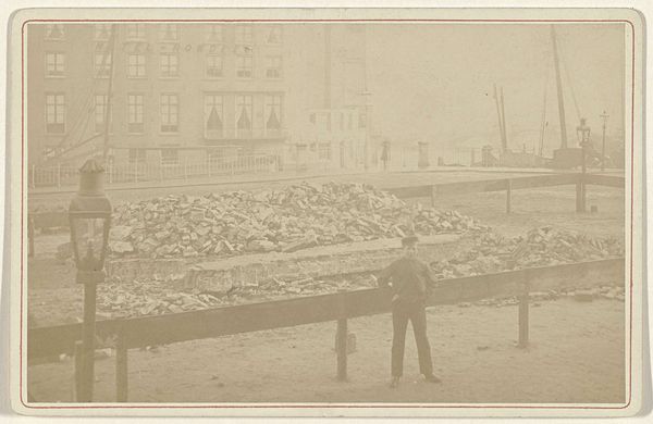 Curator: At first glance, there's a compelling tension between order and chaos. The architectural rigor of the building is juxtaposed against what appears to be a floral avalanche cascading down the steps. Editor: Indeed. This photograph, quite possibly from 1946, captures Princess Juliana on the balcony. The piece, entitled "Prinses Juliana op het bordes" by K. Raucamp, is a gelatin-silver print here in the Rijksmuseum collection. Note how the stark black and white enhances the somber, almost reverential, mood. Curator: Precisely. The tonality reinforces that mood, yes. Notice the texture, how the granular quality of the gelatin-silver print emphasizes the sheer quantity and mass of flowers. Semiotically, the flowers serve as a collective symbol—an outpouring of emotion. Editor: But also, I’m drawn to the labor involved. Think of the hands that cultivated, picked, arranged, and transported these blossoms. This isn't just an image of royalty; it is equally a document of mass mobilization. These are likely post-war commemorations. The flowers themselves – ephemeral, perishable goods – point to the cycles of production, consumption, and ultimately, decomposition. Curator: A powerful observation. Looking at it from a compositional viewpoint, though, it seems evident the way the photographer utilizes diagonals is particularly strong here—note how the flowers spill down the staircase drawing the eye upwards. Editor: And downwards as well— towards that lone figure in the foreground, presumably a security person. His very rigid form contrasts so sharply with the fluidity of flowers, embodying the work of securing this national symbol. Curator: An intentional interplay, no doubt, meant to underscore the weight of leadership against the backdrop of popular support. This print skillfully balances form and concept, capturing a precise moment in history while prompting us to contemplate broader, almost universal themes. Editor: Precisely. Thinking through the labor of image creation reminds us photography's connection to the real and imagined lives of a whole nation at that time. I find the historical lens fascinating.