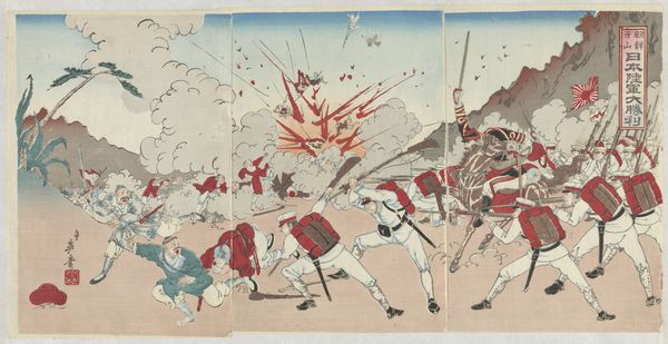 This color woodcut triptych by Yôshû Nobuyasu depicts the Japanese army's occupation of Uiju, a city in Korea, during the First Sino-Japanese War. Created in Japan, this print showcases a moment of nationalistic fervor. It reflects the country's imperial ambitions during the late 19th century. The image creates meaning through visual codes such as the Japanese flag being prominently displayed, symbolizing military might and territorial expansion. Historical associations such as Japan’s desire to establish itself as a modern power influenced the artwork. The print is a product of Meiji-era Japan, a period of rapid modernization and Westernization that shaped artistic production. By examining period newspapers, government documents, and military records, we can better understand the social and institutional context of such works of art. The meaning of art is contingent on these contexts.