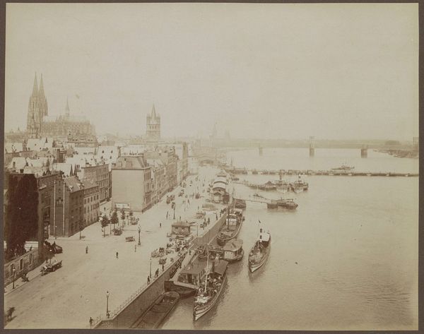 Editor: Here we have an anonymous photograph entitled "Istanbul with a bridge in the middle and a tower with a dome on the right", likely created between 1909 and 1918, and made using the albumen print process. The composition feels incredibly dense; you can almost sense the city's teeming activity. What are your initial thoughts on this work? Curator: It’s important to acknowledge albumen prints in relation to the development of mass media. The albumen process involved coating paper with egg white, which was readily available. This relatively accessible method speaks to the burgeoning of photographic image production. Considering its orientalist style, how might this widespread use of albumen prints reinforce power dynamics between the West and the East through representation and consumption? Editor: That's interesting – I hadn’t considered the power dynamics inherent in the medium itself! Are you suggesting that even the means of producing and distributing these images played a role in reinforcing orientalist views? Curator: Precisely! Who controlled the photographic studios? Who profited from the sale and circulation of these images? And who had the privilege to consume them? Think about the labour involved. Was it all local or imported? These material conditions significantly shaped the narratives presented in these photographs. The “monochrome” look is not just aesthetic – it also reveals the technical limitations of the period and the industrial processes behind it. Editor: So, looking at this photograph, you're not just seeing a cityscape but also a complex web of labour, materials, and economic relationships that influenced how Istanbul was presented to the world. Curator: Exactly. Examining the albumen print shifts our focus from a simple picturesque view to the social and material circumstances of its production, circulation, and consumption. Editor: I’ve definitely gained a new perspective. I am realizing that even something as seemingly straightforward as a photograph can be a product of complex systems of power and economics. Thanks!