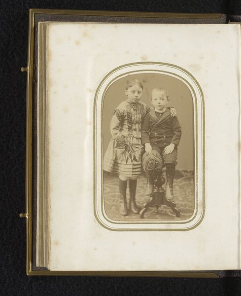 This is a photograph titled 'Portret van twee jongens' by Elias Gottheil, made in an unknown year. The sepia tones and intimate scale evoke a sense of nostalgia, framing its subjects within a structured composition. Gottheil uses the formal structure of portraiture to engage with broader themes of representation. The two boys, positioned closely together, create a tightly knit structure, the older boy’s hand resting on the other’s shoulder. The curtain backdrop and their matching outfits add symmetry, yet subtle variations in their poses introduce a dynamic tension. Their outfits give us a sense of structure, echoing a military style, representative of the societal pressures placed on young boys. The sepia tone flattens the image, emphasizing surface over depth and highlighting the photograph's status as an object. This flattening aligns with formalism’s focus on the artwork's inherent properties, inviting us to consider how its visual elements create meaning. This photograph challenges fixed meanings, prompting ongoing interpretation.