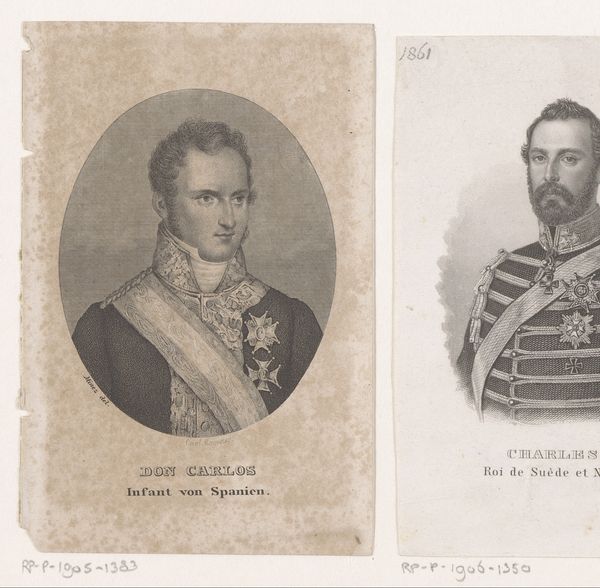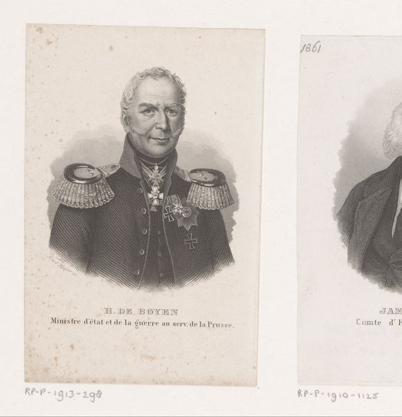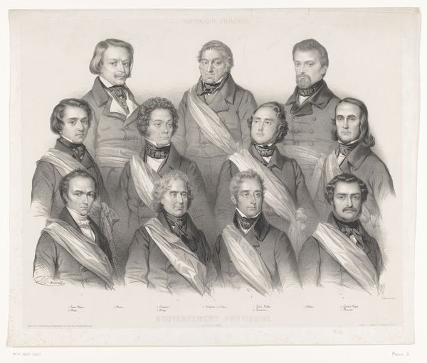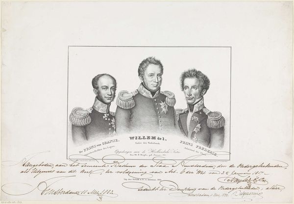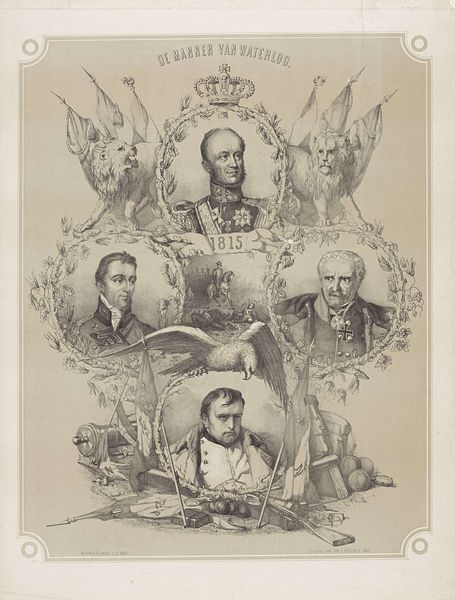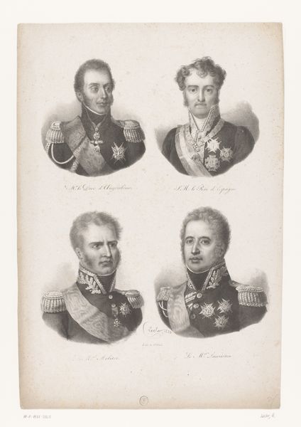 Editor: This is "Vijf portretten van maarschalken en generaals" or "Five portraits of marshals and generals" by Antoine Fulcrand Carrière, from 1835. It's an engraving. I’m immediately struck by the hierarchical composition. The two generals at the top almost seem to float above the others. What do you see in this piece, considering the printmaking process? Curator: I'm immediately drawn to the implications of producing this image as a print. Consider the economic and social context: printmaking allowed for the widespread distribution of these portraits. The materials used – the paper, the ink, the metal plate for the engraving – they all speak to a specific mode of production, where images of power became accessible, as commodities, to a wider audience. This shifts the aura surrounding these military figures, doesn’t it? Editor: So, instead of solely focusing on these individuals, you’re highlighting how the mechanics of creating the print democratizes their image? Curator: Precisely! It's not just about commemorating these figures. We have to consider who commissioned the work, who printed it, who bought it, and how the act of reproduction affected the reception of these men. Look at the repetitive details in their uniforms – think of the artisan hours that must have been involved. That labor, often invisible, is crucial to our understanding of this artwork. Does viewing it as a manufactured object challenge your initial reading of its mood? Editor: It definitely adds a new layer! The engraving isn't just a neutral reproduction, but an object reflecting a complex web of labor and consumption. It makes me wonder about the social status of people who acquired a print like this one, or its implications in influencing public opinion. Curator: Indeed. Examining the materiality reveals that the print acted as more than just a commemorative piece. It became a tool, circulating ideas and shaping perceptions within a growing consumer culture. It prompts questions about art’s broader purpose. Editor: Thanks, I will definitely keep that in mind for future analysis!
