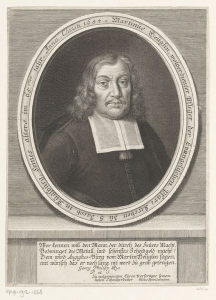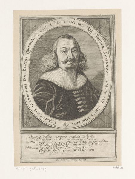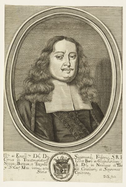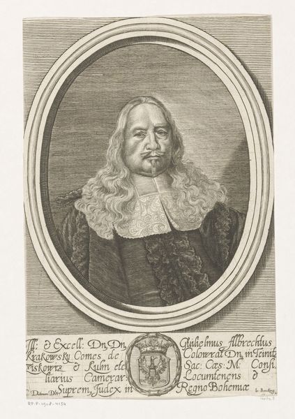 Editor: This engraving, "Peter Bülcke," created between 1664 and 1667 by Albert Haelwegh, presents a dignified portrait within an oval frame. The lettering around the portrait adds to the formality, but it’s his direct gaze that I find most compelling. How do you interpret this work, considering its historical context? Curator: The formality you notice is crucial. Consider the historical and political context. Bülcke served the Danish-Norwegian crown, a period marked by intense power struggles and shifting alliances. How might this portrait, commissioned during his lifetime, contribute to the construction and maintenance of his image and, by extension, the power of the state? Editor: I hadn’t thought about it as actively constructing power. I was more focused on it as a simple depiction of someone important. The engraving style makes him look serious, authoritative… maybe even unapproachable? Curator: Exactly. Think about the role of portraiture in the 17th century. It wasn't merely about likeness; it was about projecting an ideal. How does the artist utilize conventions of Baroque portraiture to convey status and authority? Consider the gaze, the clothing, even the surrounding inscription – each element reinforces a carefully constructed narrative of power. Editor: So, every element serves to legitimize Bülcke's position and the power he represents? It makes me think about who gets to be remembered and how history often silences marginalized voices. Curator: Precisely! And asking those questions is exactly where we need to be. This piece allows us to critically examine the systems of power at play. By engaging with these artworks, we begin to recognize how these dynamics continue to shape our world today. Editor: I see the image in a new light now, as a deliberate statement about power, which opens doors to understanding societal and political structures of that time. Thanks! Curator: And you helped clarify how crucial it is to question these "official" portrayals and look for the counter-narratives often absent from history.
