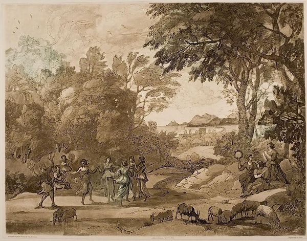 Curator: Welcome. Before us, we have Thomas Rowlandson's "Dover Coach." It's an undated piece rendered in ink and watercolor, a charming example of plein-air landscape, now residing here at the Art Institute of Chicago. Editor: The scene feels like a fleeting snapshot. Despite the gentle wash of the watercolors, there’s a lively energy—almost as if the horses and coach are about to gallop right off the page. Curator: I agree. The quick, gestural lines give a real sense of immediacy, indicative of its Romantic-era approach to landscape. Notice how the coach itself is quite detailed; its design is intended to visually communicate the status and wealth of its occupants. Also note how it emphasizes that the location where it was produced influenced the making of art by a privileged class. Editor: Right, it's about luxury and speed. And observe how that contrasts with the rest of the scene—the pastoral simplicity of the mother and child, the lounging patrons of the inn. Rowlandson sets up a clear dichotomy: movement versus stasis. Also notice how Rowlandson employs popular themes—the traveler on a journey of adventure. Curator: Absolutely, and looking closer at those figures—the coach passengers seem almost comically crowded. I’d like to examine the paper used. You can see slight variations, like a texture with a hint of cotton. It is as much about everyday life of ordinary subjects depicted through images that have become archetypal symbols, as about artifice and status. The Romantic lens romanticizes them, even those like the inn patrons who are still connected to labour. Editor: I find myself thinking about how we receive this image today, what the memory and emotional associations with that sort of scene have evolved to represent. What was an experience only enjoyed by the wealthy, we may experience with an appreciation to a life simpler, lived in contact with Nature and its beautiful green. Curator: Well, viewing through a Materialist approach and taking a Romantic view simultaneously allows a conversation across eras that are often taken to be contrasting moments. Editor: Exactly. These symbols evolve to have completely different resonance as our collective unconscious matures with the times. It shows the powerful link to the past. Curator: Indeed. I've noticed new connections within its visual construction. Editor: And I, deeper appreciation of its evocative narrative.