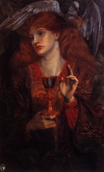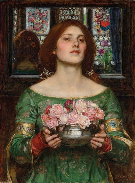 Curator: Here we have Dante Gabriel Rossetti's oil painting "The Loving Cup," created in 1867. It's a prominent piece in the Pre-Raphaelite collection here at the Art Gallery of South Australia. Editor: Oh, wow, the instant feeling I get is melancholy. The auburn-haired woman has this faraway look, a little pensive, almost like she's questioning the contents of that ornate cup she's holding. Curator: Note the deliberate arrangement of the elements. Rossetti carefully composes the woman against a backdrop featuring stylized decorative elements, positioning her in a pictorial space that is both intimate and symbolic. Editor: Right, that background pattern seems repetitive but holds secrets too. But honestly, her expression really grabs you; it makes me think about choices and perhaps the bittersweet nature of some decisions. You know? Curator: It certainly evokes layered readings. Rossetti frequently uses color to convey mood; in this painting, the red palette of her dress and the cup might suggest passion but equally hint at themes of sacrifice or inner turmoil. Editor: Yes, definitely inner turmoil, which I suspect all of Rossetti’s characters convey on closer inspection. It's a strange painting actually – she’s sort of burdened with her ornaments – neckless, bands – yet liberated and strangely ethereal too. Is she meant to represent someone specific? Curator: Rossetti, along with other Pre-Raphaelites, blended their artistic expressions with historical and literary narratives. Often, he worked with close family, friends and mistresses as muses so this woman, this "stunner" is almost a figment born out of her status in society and relationship to the artist. She is therefore at once very particular but at the same time represents a romantic and classicising type – hence this sense of symbolic burdening or, conversely, release, you observe. Editor: How utterly… romantic! It's so captivating how an artist can freeze a feeling in time like that. "The Loving Cup" speaks volumes without uttering a single word. Curator: Indeed. And how Rossetti positions the female figure within this meticulously constructed space offers significant insight into the complex narratives Pre-Raphaelitism sought to explore and communicate. Editor: Makes you wonder what that drink really tasted like… perhaps something that tastes beautiful, and heartbreaking, all at once?
