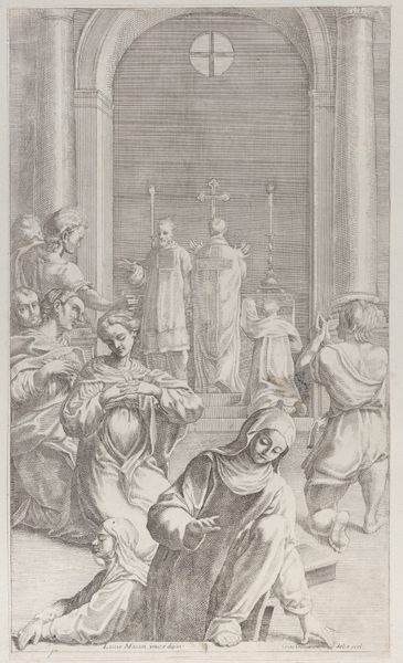 Curator: Here we have Pieter de Jode I’s "Christus wordt door Pilatus naar Herodes gestuurd," an engraving from between 1590 and 1632. It depicts a key moment from the Passion. Editor: My first thought is how the stark contrasts in this print create a very harsh and almost brutal mood. You can almost feel the rough fabric of Christ's robe, the cold stone under Herod's feet... it's very immediate. Curator: Absolutely. De Jode uses the graphic qualities of engraving to highlight the power dynamics. Pilate, having realised Jesus is from Herod's jurisdiction, sends him off to face another judgement. Symbolically, the architecture is quite telling. Note the cold stone against the fragile flesh. Editor: Yes, and I am always drawn to architectural symbols. The column, the broken pillar segment in the foreground... Rome is beginning to crumble, symbolically perhaps? Justice is flawed? I see Herod on the platform as this detached figure almost untouched by the suffering before him. The detailing around his figure really emphasizes the way injustice functions within a cold and unfeeling structure. Curator: He stands in shadow, detached. It's a fascinating compositional choice. Christ, though the ostensible subject, is being tugged towards the background; yet, light illuminates Pilate pointing him away toward the secondary trial and ultimate death sentence. The way his halo glows amidst such rough handling brings the symbolism full circle. There's a painful humility in it, somehow. Editor: I agree, and there's also something about the almost faceless soldiers, or men at arms. Their forms are functional, they're just spears, and grips. You almost lose their humanity, again reflecting the callous treatment of Jesus. Even Pilate washing his hands to wash off responsability is something akin to them losing their faces for being used to perpetrate these injustices. Curator: Indeed. And even without color, de Jode evokes such texture—the shine on the armor, the dullness of the stone... Editor: It's a masterclass in black and white symbolism that transcends just the religious story and explores the weight of authority and morality, of choices and what symbols truly come to mean within our visual understanding of things. It resonates with the darker corners of human behaviour in a profoundly modern way. Curator: Ultimately, an important work in our collection at the Rijksmuseum. Editor: Yes, it leaves me with many threads to pull, ideas to mull over long after. It serves to say, what resonates now, and what continues to persist.