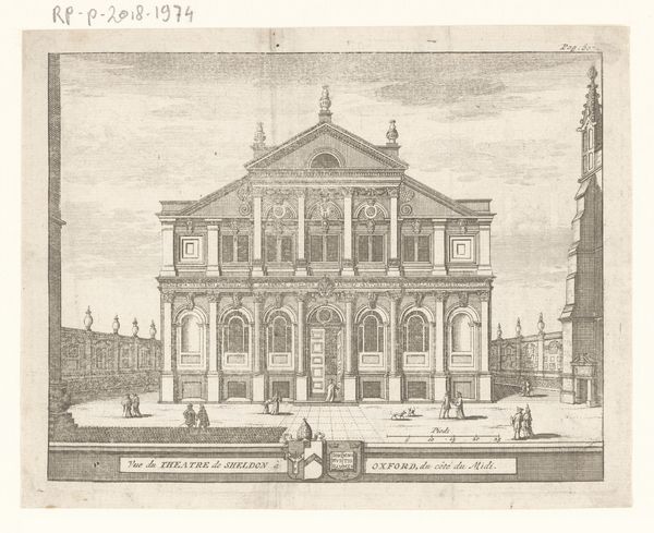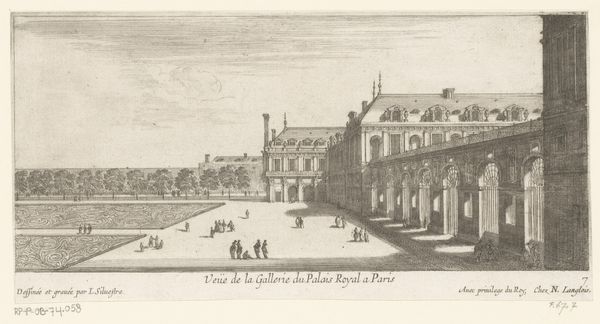 Israel Silvestre created this print, "View of the Church of Saint-Bernard," during a time of significant religious and political transformation in Europe. Silvestre, born into a Protestant family in France, specialized in topographical views, capturing the architecture and urban landscape of his era. This print offers a glimpse into the cultural values of the 17th century, depicting not just the church but also the social life unfolding around it. We see people of different classes, from the gentry arriving in carriages to the commoners gathered in the square. Silvestre's choice to include these figures situates the church within the everyday lives of the people, highlighting its role as a central point of communal activity. It invites us to reflect on the intersection of sacred and secular spaces, and the ways in which architecture shapes our social interactions and collective identity.