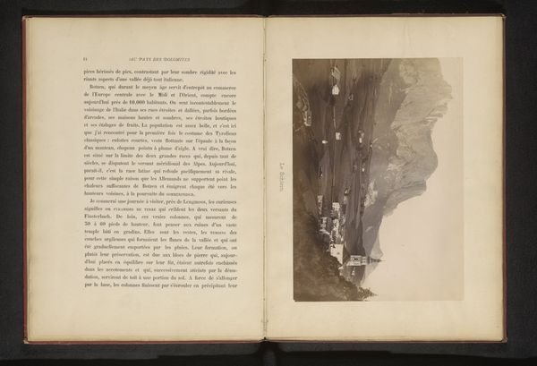 This photograph of the Langkofel mountain group in the Dolomites, Italy, was created by Eugène Goblet d'Alviella. The photograph’s sepia tones and subtle gradations draw us into its textured surfaces; the mountain’s rocky crags and weathered faces are sharply defined. The photographic process itself – from the labor of setting up the camera, to the meticulous work in the darkroom – would have been time-intensive. The value of the image comes not just from its aesthetic appeal, but also as a record of a specific place and moment in time. Interestingly, the facing page describes the village of Saint-Ulrich and its local wood carving industry, and the degree to which production is divided. A whole economy is described around the image of the landscape, which can be seen to be a type of extraction. Paying attention to materials, making, and context allows us to challenge the traditional hierarchy between fine art and craft.